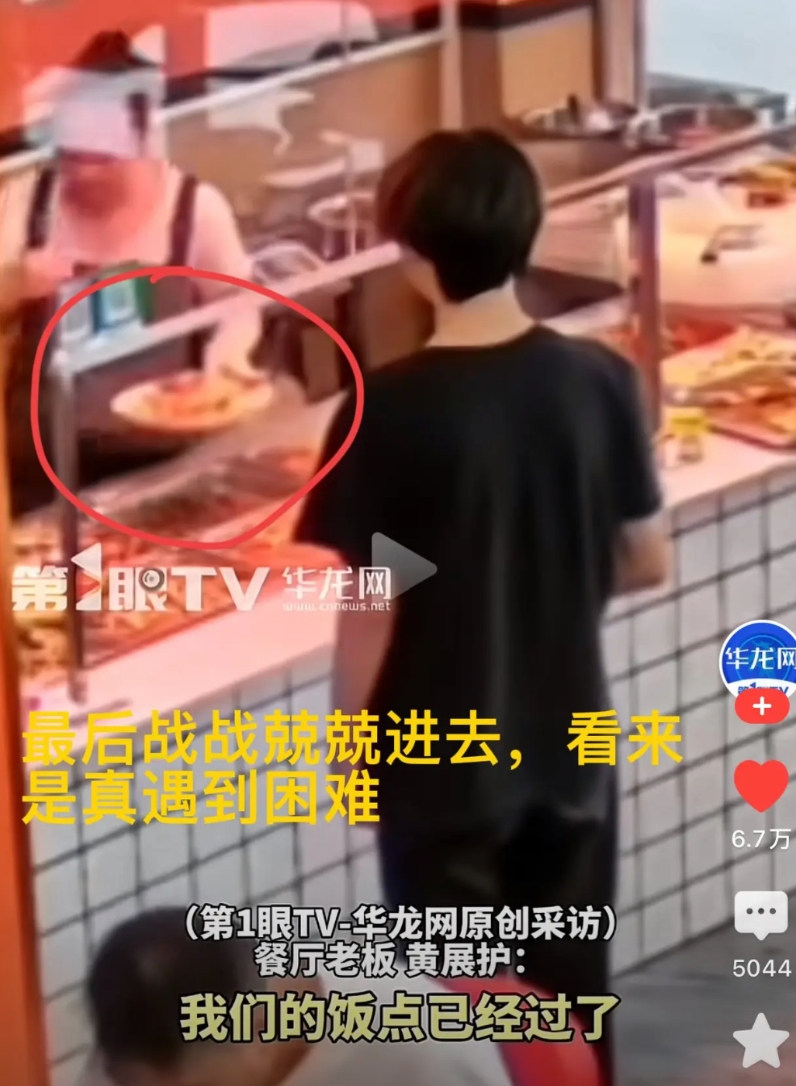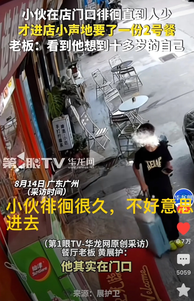 8月14日,一名穿着黑色体恤的年轻人,饭点的时候看到里面人多,在他店门口徘徊很久,不好意思进去,等到过了饭点,这名年轻人才不好意思战战兢兢进去,小声说到点一份2号餐。