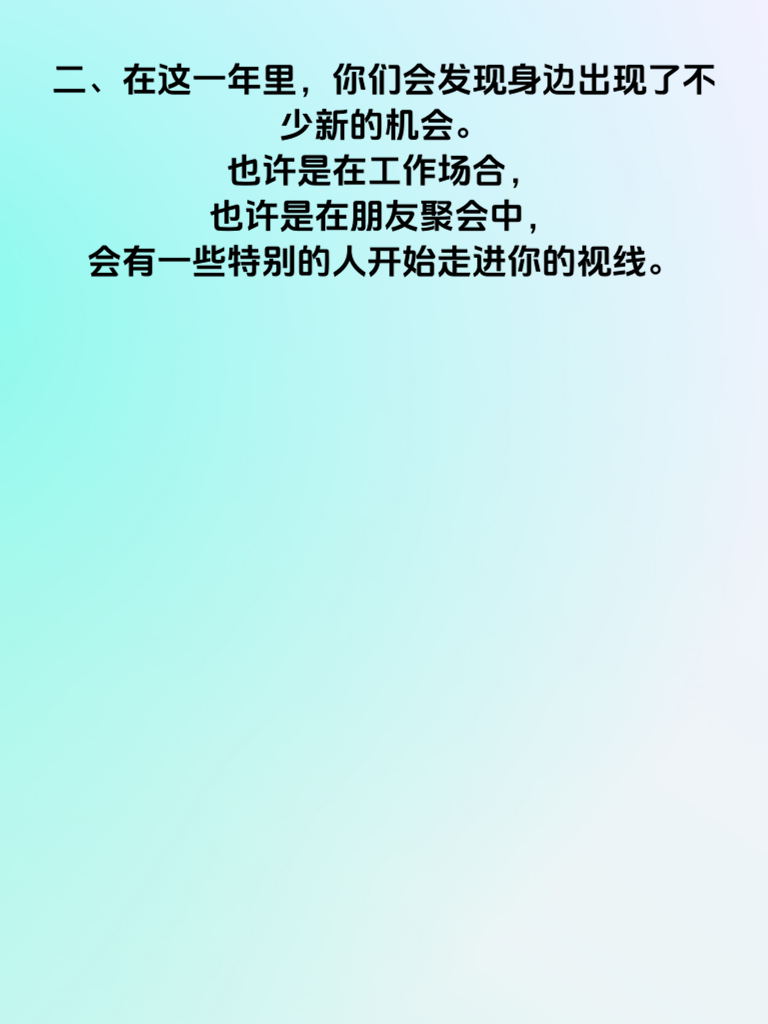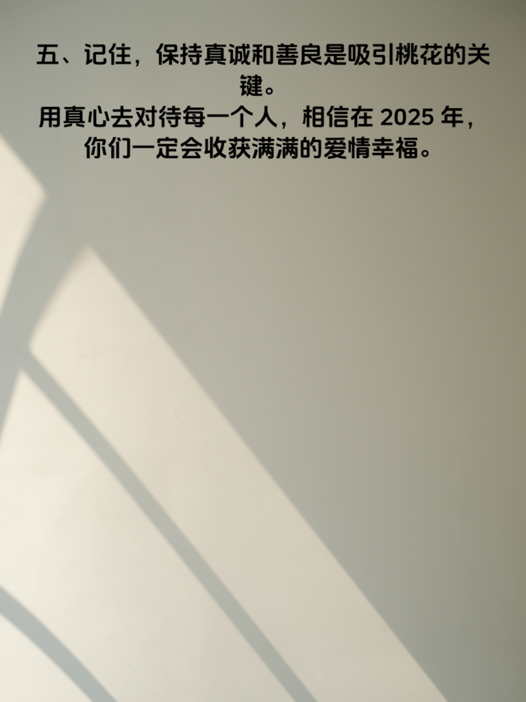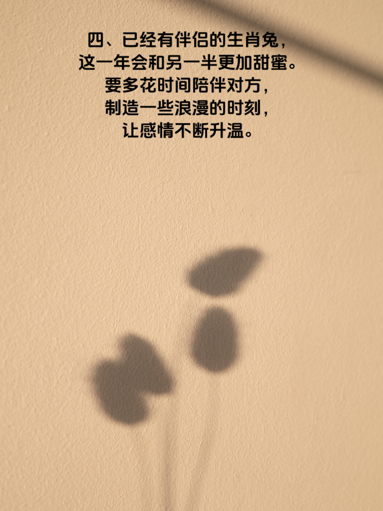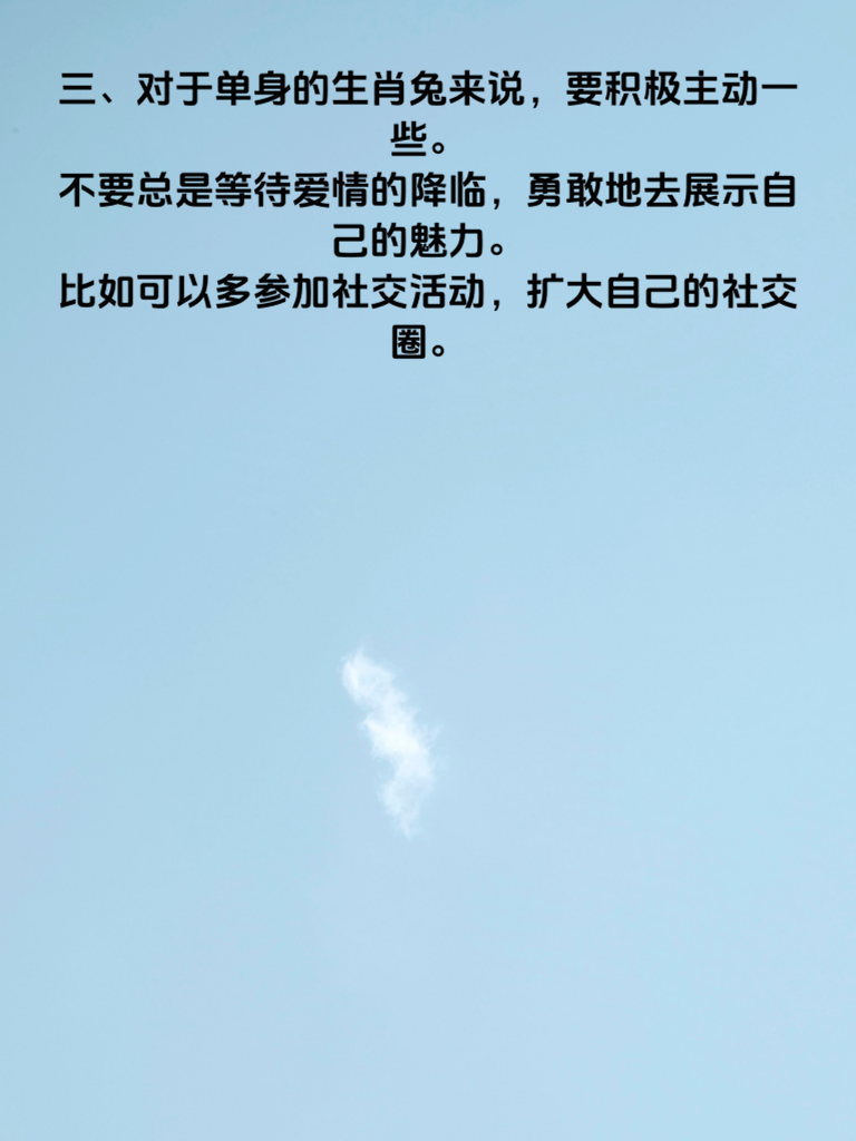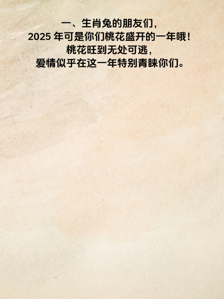 一、生肖兔的朋友们,2025年可是你们桃花盛开的一年哦!桃花旺到无处可逃,爱情似乎在这一年特别青睐你们。 二、在这一年里,你们会发现身边出现了不少新的机会。也许是在工作场合,也许是在朋友聚会中,会有一些特别的人开始走进你的视线。 三、对于单身的生肖兔来说,要积极主动一些。不要总是等待爱情的降临,勇敢地去展示自己的魅力。比如可以多参加社交活动,扩大自己的社交圈。 四、已经有伴侣的生肖兔,这一年会和另一半更加甜蜜。要多花时间陪伴对方,制造一些浪漫的时刻,让感情不断升温。 五、记住,保持真诚和善良是吸引桃花的关键。用真心去对待每一个人,相信在2025年,你们一定会收获满满的爱情幸福。