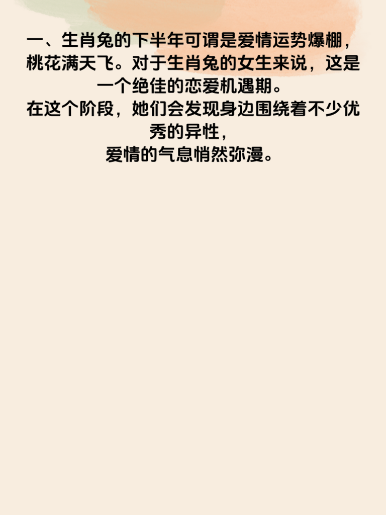 一、生肖兔的下半年可谓是爱情运势爆棚,桃花满天飞。对于生肖兔的女生来说,这是一个绝佳的恋爱机遇期。在这个阶段,她们会发现身边围绕着不少优秀的异性,爱情的气息悄然弥漫。 二、生肖兔的女生温柔善良,心思细腻,在下半年更容易吸引到那些欣赏她们内在美的男生。她们的亲和力会让周围的人感到温暖,从而增加自身的魅力值。 三、在社交场合中,生肖兔女生要更加自信地展现自己。不要过于羞涩,积极参与各种活动,主动与他人交流互动。这样能让更多的人认识你,扩大自己的社交圈,增加遇到心仪对象的机会。 四、同时,生肖兔女生也要保持真诚。以真心对待每一个人,不做作,不虚伪。当遇到合适的人时,勇敢地表达自己的情感,不要错过这难得的桃花季,相信下半年一定会收获美好的爱情。