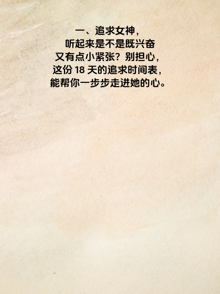 一、追求女神,听起来是不是既兴奋又有点小紧张?别担心,这份18天的追求时间表,能帮你一步步走进她的心。 二、前3天,先默默观察她。了解她的喜好、日常习惯。比如她爱去哪家咖啡店,喜欢什么类型的音乐。这能让你之后的行动更贴心。 三、第4 - 6天,找机会自然地和她搭上话。从简单的问候开始,慢慢聊一些共同感兴趣的话题,像最近看的一部有意思的电影。 四、7 - 9天,约她一起做些轻松的活动,比如散步、逛公园。在相处中展现你的幽默和绅士风度,让她感受到你的魅力。 五、10 - 12天,送她一份小惊喜。可以是一本她喜欢的书,或者一束鲜花。但别太刻意,要让她觉得惊喜又温馨。 六、13 - 15天,深入交流彼此的梦想和价值观。这能让你们更了解对方,拉近心灵的距离。 七、16 - 18天,勇敢表白!真诚地说出你的心意,用你的热情和真心打动她。记住,自信是关键。只要按照这个时间表用心去做,18天后,你很可能就能如愿牵起女神的手啦!