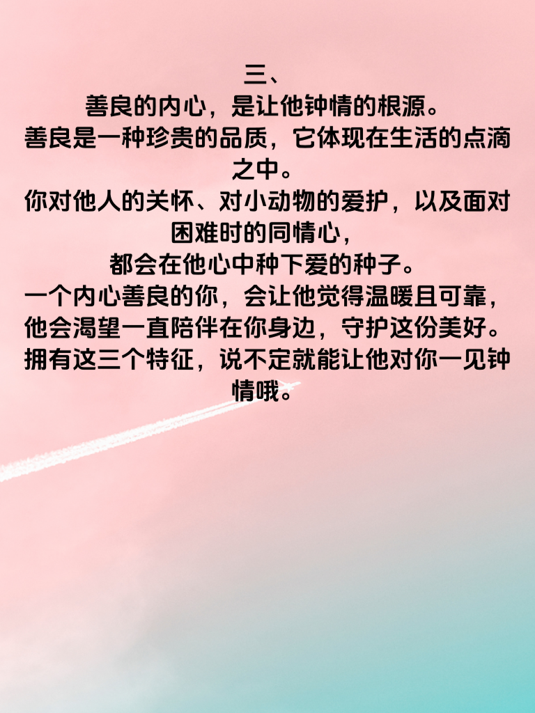 一、真诚的笑容,是打动他的开场。真诚的笑容具有强大的感染力,能瞬间拉近你们之间的距离。当你微笑着看向他,那笑意直达眼底,会让他感受到你的友善与亲和力,仿佛整个世界都亮了起来。这种笑容不是刻意伪装,而是发自内心的喜悦流露,它能消除彼此的陌生感,让他对你产生想要进一步了解的冲动。 二、独特的气质,是吸引他的磁场。每个人都有独特的气质,或温婉如水,或活泼灵动,或知性优雅。展现属于你的独特魅力,能让他在人群中一眼就注意到你。比如,你专注做一件事时认真的模样,或是不经意间流露的小才情,都会成为他眼中独特的风景,吸引着他靠近你,想要探寻更多关于你的美好。 三、善良的内心,是让他钟情的根源。善良是一种珍贵的品质,它体现在生活的点滴之中。你对他人的关怀、对小动物的爱护,以及面对困难时的同情心,都会在他心中种下爱的种子。一个内心善良的你,会让他觉得温暖且可靠,他会渴望一直陪伴在你身边,守护这份美好。拥有这三个特征,说不定就能让他对你一见钟情哦。