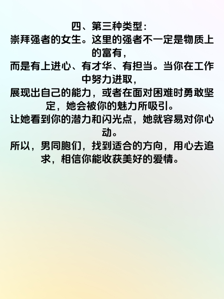 一、男人必知:这3个类型女生最易动心。在追求女生的道路上,了解她们的喜好和心理是关键。掌握这些技巧,能让你更容易走进她的心。 二、第一种类型:温柔善解人意的女生。她们总是以温和的态度对待他人,善于倾听和理解。当你在她面前倾诉烦恼时,她会耐心陪伴,给予安慰。这样的女生渴望真诚的情感交流,如果你能展现出你的真心,对她体贴入微,很容易让她心动。 三、第二种类型:有共同兴趣爱好的女生。如果你们都热爱某项运动、喜欢同一种音乐或者对某个领域有共同的见解,那就有了很好的话题基础。一起参与这些活动,分享彼此的感受,能迅速拉近你们的距离,让她发现你们之间的默契,从而对你产生好感。 四、第三种类型:崇拜强者的女生。这里的强者不一定是物质上的富有,而是有上进心、有才华、有担当。当你在工作中努力进取,展现出自己的能力,或者在面对困难时勇敢坚定,她会被你的魅力所吸引。让她看到你的潜力和闪光点,她就容易对你心动。所以,男同胞们,找到适合的方向,用心去追求,相信你能收获美好的爱情。