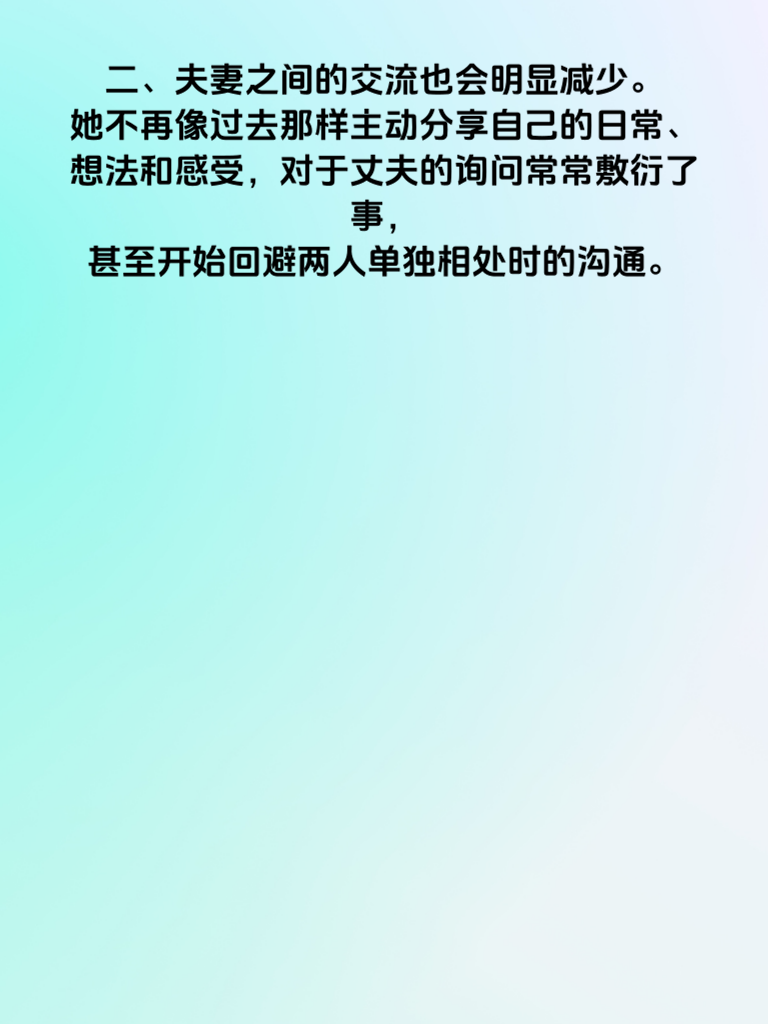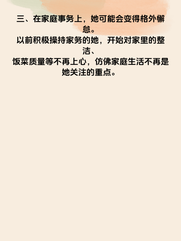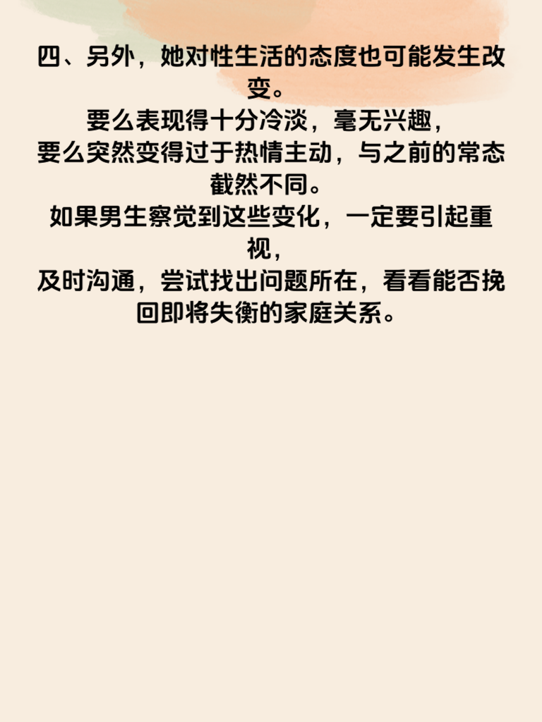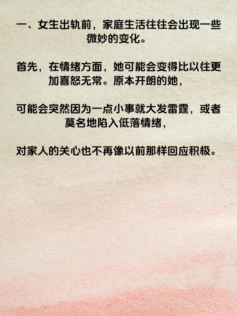 一、女生出轨前,家庭生活往往会出现一些微妙的变化。首先,在情绪方面,她可能会变得比以往更加喜怒无常。原本开朗的她,可能会突然因为一点小事就大发雷霆,或者莫名地陷入低落情绪,对家人的关心也不再像以前那样回应积极。 二、夫妻之间的交流也会明显减少。她不再像过去那样主动分享自己的日常、想法和感受,对于丈夫的询问常常敷衍了事,甚至开始回避两人单独相处时的沟通。 三、在家庭事务上,她可能会变得格外懈怠。以前积极操持家务的她,开始对家里的整洁、饭菜质量等不再上心,仿佛家庭生活不再是她关注的重点。 四、另外,她对性生活的态度也可能发生改变。要么表现得十分冷淡,毫无兴趣,要么突然变得过于热情主动,与之前的常态截然不同。如果男生察觉到这些变化,一定要引起重视,及时沟通,尝试找出问题所在,看看能否挽回即将失衡的家庭关系。