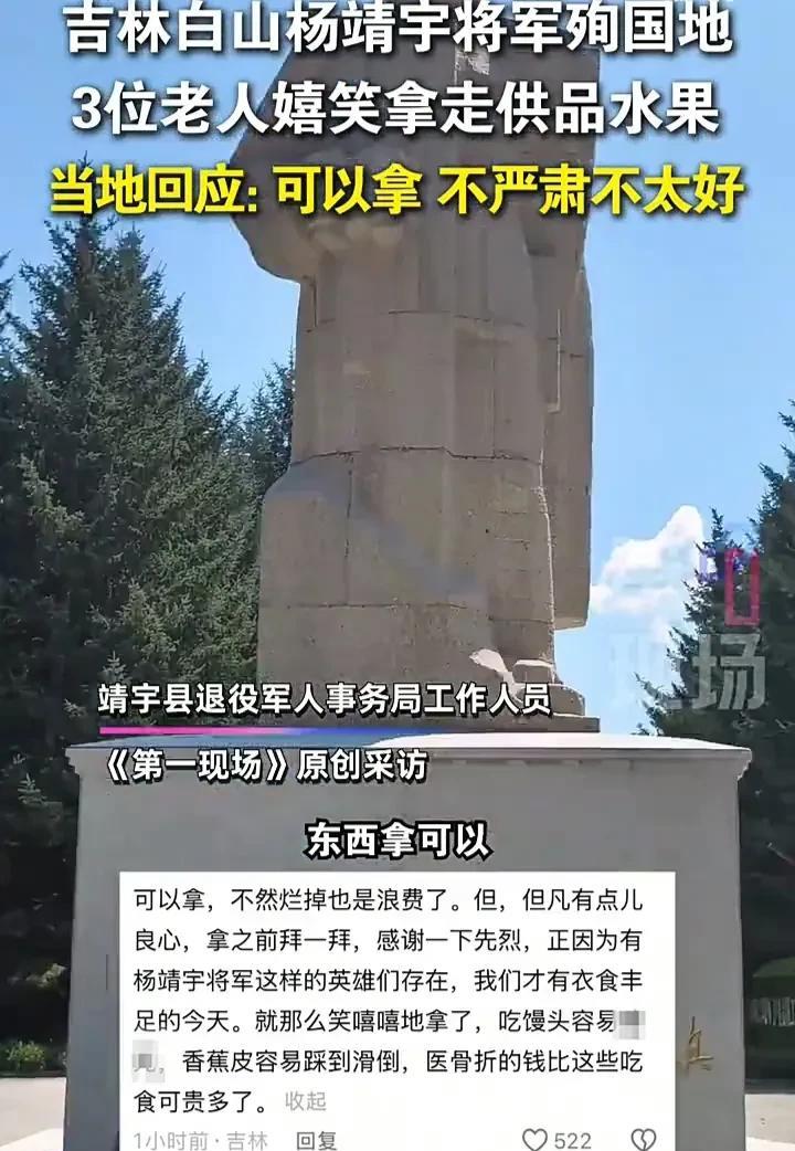 毫无敬畏之心,真的太丢人了!8月15日,吉林白山一名网友发视频称,在杨靖宇将军殉国地纪念碑前,三位老人嬉笑着拿走贡品水果,对此相关工作人员回应,贡品可以拿,但嬉笑着不严肃不好,个人素质问题。