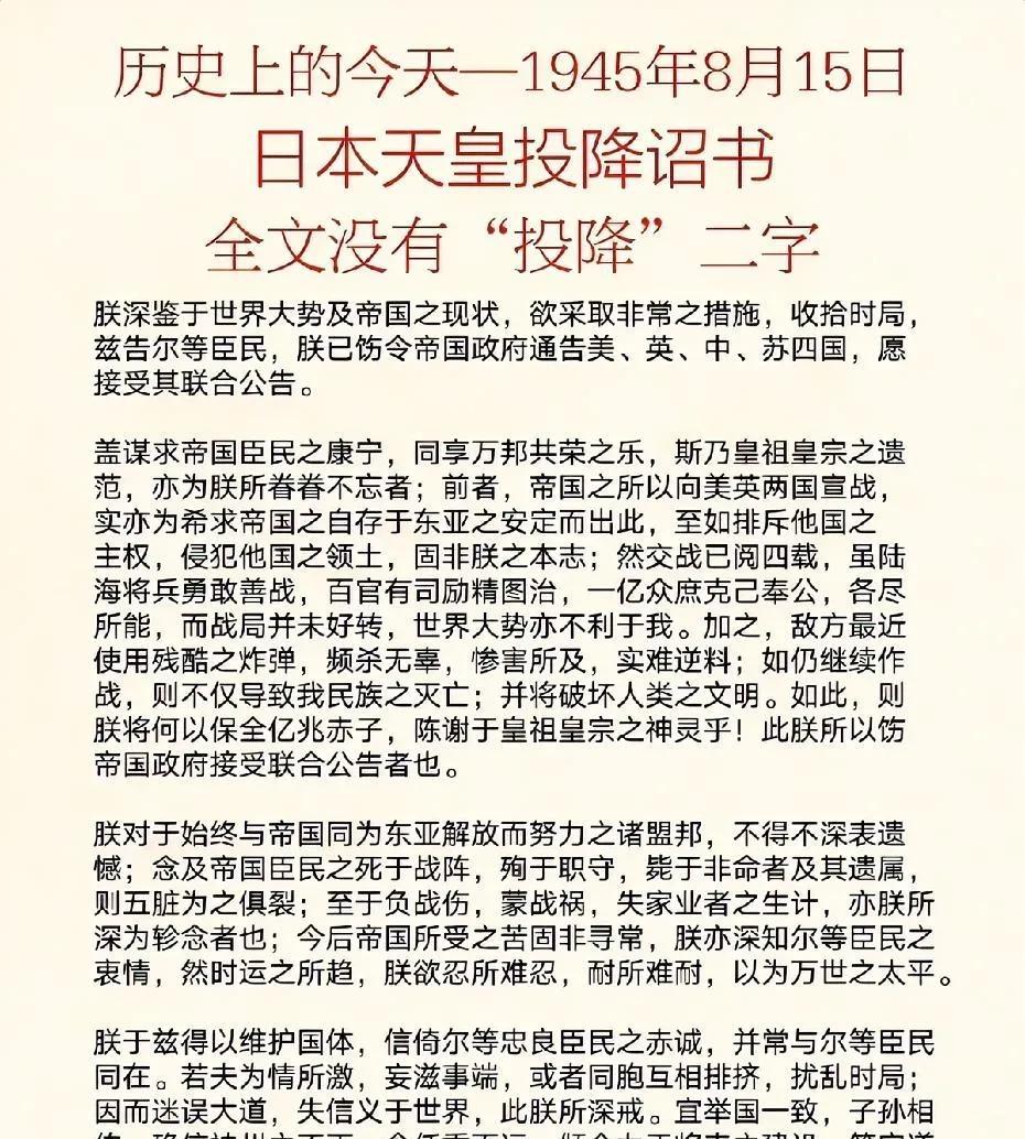 80年前的今天,也就是1945年8月15日,日本天皇宣读《终战诏书》宣布无条件投降,可这诏书全文竟无“投降”二字。 从1931年“九一八事变”到1945年日本投降,14年里,日本侵略中国,930余座城市先后被占,3500多万同胞伤亡,4200多万难民无家可归,经济损失达6000亿美元。东北抗日联军顽强斗争,淞沪会战中国军队殊死抵抗,无数英雄儿女奋勇牺牲。 日本投降那天,举国欢庆。但我们不能忘记历史的伤痛,更要警惕日本这种不肯正视历史的态度。