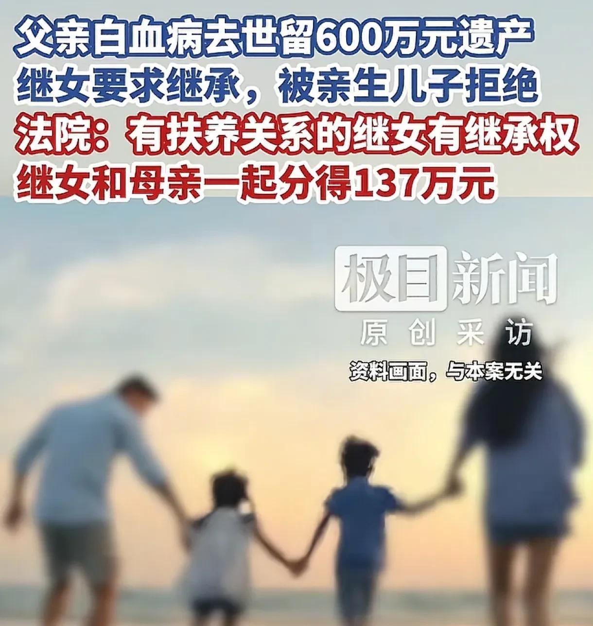 湖北黄石,女子带着女儿嫁给男子,双方在一起10多年,男子去世后,留下房产、基金、股票等遗产600余万元,女子认为自己和女儿都可以分,可男子与前妻生的儿子却认为,父亲的遗产都应该归他分配,双方闹上法庭,结局让人意想不到。 8月15日,光明网报道了一起继女与儿子争夺遗产的纠纷案例。 程先生与妻子婚后育有一子小程,不过夫妻感情不和,早年离婚,小程跟随父亲一同生活。 10多年前,程先生邂逅了离异且带着女儿的姚女士,两个有着相似经历的人很快走到一起,并登记结婚。 婚后,姚女士带着女儿小姚住进了程先生家里,程先生是做生意的,家境颇丰,他对小姚视如己出,悉心培养。姚女士对小程也关怀备至,一家人和睦相处了10多年。 2024年12月,程先生因病离世,他留下了包括房产、股票和基金在内,价值600余万元的遗产,但未留下任何遗嘱和安排。 处理完程先生的身后事后,姚女士母女和小程就遗产继承问题发生了激烈的争执。 小程认为既然父亲没有留下遗嘱,那么按照法定继承来处理父亲的遗产,自己作为父亲唯一的亲生儿子,遗产理应由他来全部分配。 《民法典》第1123条规定:继承开始后,按照法定继承办理;有遗嘱的,按照遗嘱继承或者遗赠办理;有遗赠扶养协议的,按照协议办理。 对于继子提出的,遗产全部归他的方案,姚女士提出了反对意见,她认为自己作为程先生的配偶,有权分得遗产。 此外,她的女儿小姚与继父共同生活了10多年,女儿的学费、生活费均由自己丈夫承担,程先生对小姚尽到了抚养教育义务。 并且在丈夫病重的半年时间里,她们母女一直在照料对方,女儿对继父也尽到了赡养义务,因此女儿同样享有继承权。 双方为此僵持不下,矛盾激化,小程认为家中的财产大多数都是父亲打拼来的,继母和妹妹是在觊觎父亲的财产,自家的家产凭什么要分给一个外人。 而姚女士和小姚却感到十分委屈,这么多年来,她们也为这个家付出很多,不应遭受如此对待。 多次沟通无果后,姚女士和女儿一纸诉状将小程告上法庭,要求分得程先生的遗产。 1、继子女对继父母的遗产是否有继承权? 《民法典》第1072条规定:继父母与继子女间,不得虐待或者歧视。继父或者继母和受其抚养教育的继子女间的权利义务关系,适用本法关于父母子女关系的规定。 若继父母在未成年阶段承担抚养责任,比如给继子女提供了生活费、教育费,对继子女尽到了抚养、教育和保护义务的,双方形成了抚养教育关系。 成年后,继子女又对继父母尽到了赡养义务的,那么,继子女作为第一顺序继承人,享有与亲生子女同等的继承权。 《民法典》第1127条规定:本编所称子女,包括婚生子女、非婚生子女、养子女和有扶养关系的继子女。 在本案中,姚女士带着女儿小姚嫁给程先生时,小姚并未成年,还在上学。 程先生把她当作亲生女儿看待,陪她做作业,给她交学费,送她上大学,甚至小姚大学毕业后,程先生还给她规划工作,给她提供了很多建议。 程先生患病后,小姚也一直陪伴在他左右,陪他看病就医,跟母亲一起照顾继父,尽到了赡养义务。 程先生和小姚之间形成了具有抚养义务的继父女关系,小姚依法享有继承权。 2、在无遗嘱的情况下,同一顺序继承人继承遗产,一般应当均等。 《民法典》第1130条第1款规定:同一顺序继承人继承遗产的份额,一般应当均等。 姚女士、小姚和小程均为第一顺位继承人,平等的享有对程先生遗产的继承权。 其中,如果案涉房屋、基金、股票等属于程先生和姚女士的夫妻共同财产,那么依据《民法典》第1153条的规定,遗产分割时,当先将夫妻共同财产的一半分出为配偶所有,剩余的为被继承人的遗产。 也就是说,如果这些遗产为夫妻共同财产,那么姚女士可以先分得其中的50%,约300万左右,剩下的一半才是程先生的遗产。 经调解,姚女士母女做出让步,他们要的并不多。 最终,双方达成一致意见,姚女士母女继承137万遗产,剩余400多万遗产归小程所有。 3、家庭情况复杂的老人,可以生前采取订立遗嘱和遗赠的方式处理自己的财产。 《民法典》第1133条规定:自然人可以立遗嘱将个人财产指定由法定继承人中的一人或者数人继承,也可以立遗嘱赠与国家、集体或者法定继承人以外的组织、个人。 如果程先生当初订立了遗嘱,那么小程和姚女士母女也不为因为遗产的分配问题产生矛盾,双方根据遗嘱处理遗产即可。 关注@律觀法说 ,从法律角度看世界,感受不一样的人情冷暖。 #头号创作者激励计划#