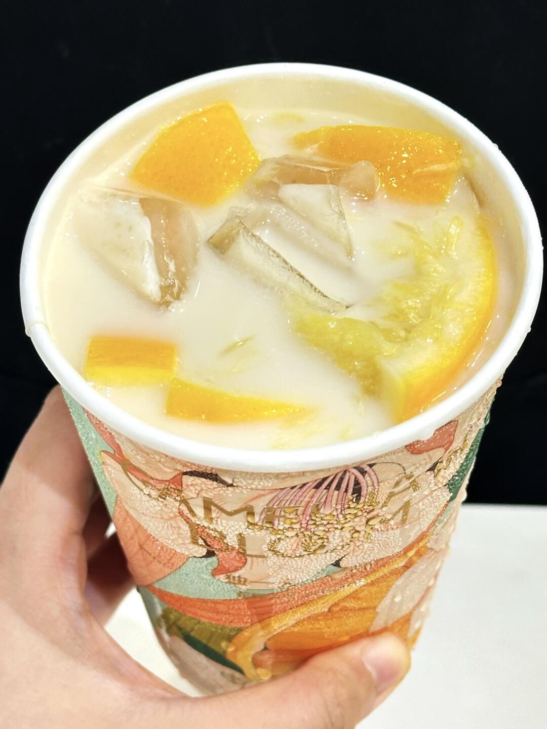 一杯喝出花香+果香+奶香+茶香四重香气!!先是超浓郁的山茶花香直冲味蕾,紧接着是吸饱阳光的鲜橙果汁带来的清新橙香,还能能吸到🍊果肉粒!紧接着轻牛乳的奶香,若隐若现,然后乌龙茶独有炭焙茶感给最后一击,啊啊啊简直完美!
