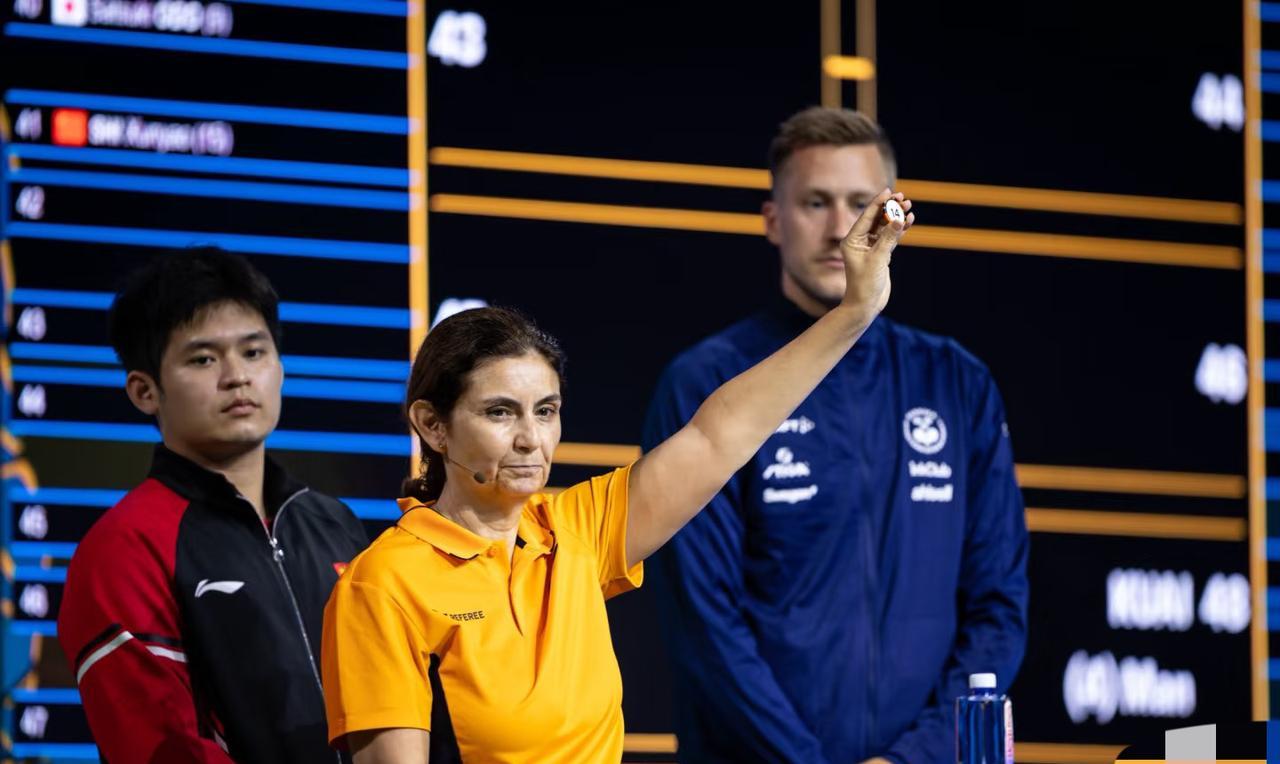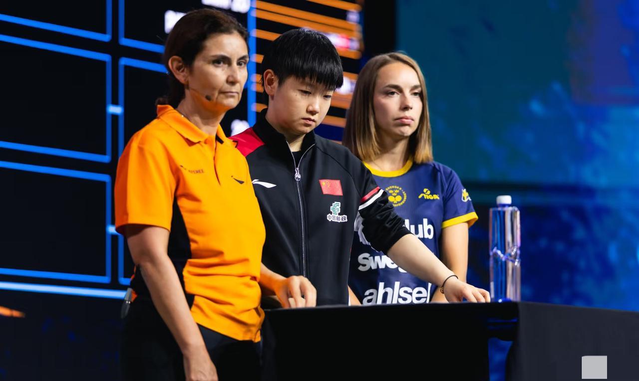 WTT官方展示孙颖莎林诗栋抽签仪式中的照片 8月15日孙颖莎林诗栋与瑞典