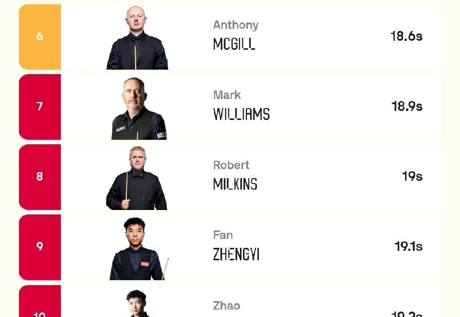 傅家俊赛季出杆速度排名世界第一! 世台联官网公布数据显示,中国球员傅家俊新赛季平均出杆速度是13.1秒,高于排名第二的罗尼奥沙利文3.3秒。 范争一和赵心童的出杆速度是19.1秒、19.2秒,位列第九和第十位。