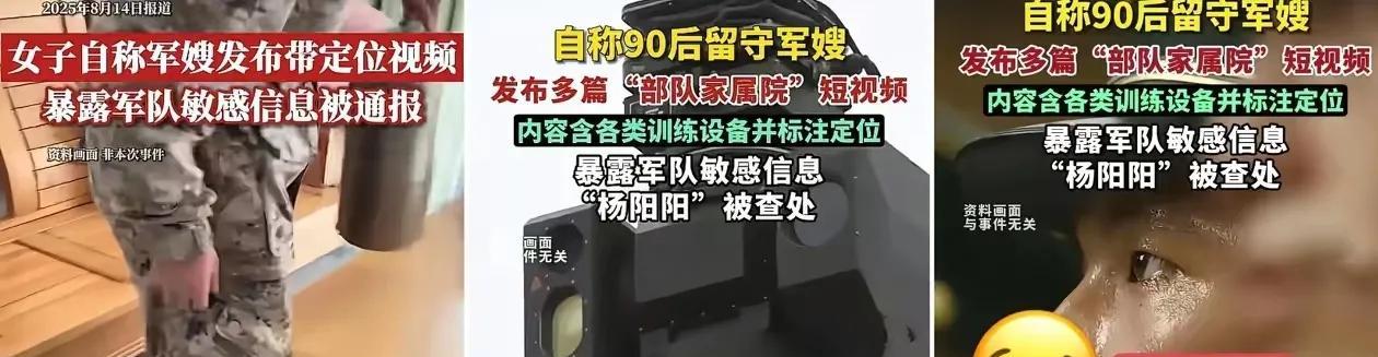 内心贫穷的人,无知,无素质,无敬畏,什么都敢炫,什么都敢晒!一个军嫂最起码的军事保密规则都不尊守,都不懂,还配当军嫂吗?!你这一炫耀是给敌人传递情报,传递军事机密信息,这是犯罪!这和间谍有什么区别!还大张旗鼓的连续发视频,真是胆大妄为!无法无天!你就那么缺钱吗?!为了钱,就可以卖国吗。作为军嫂什么该做,什么不该做,心里没数吗!还是那句话;没文化真可怕啊!