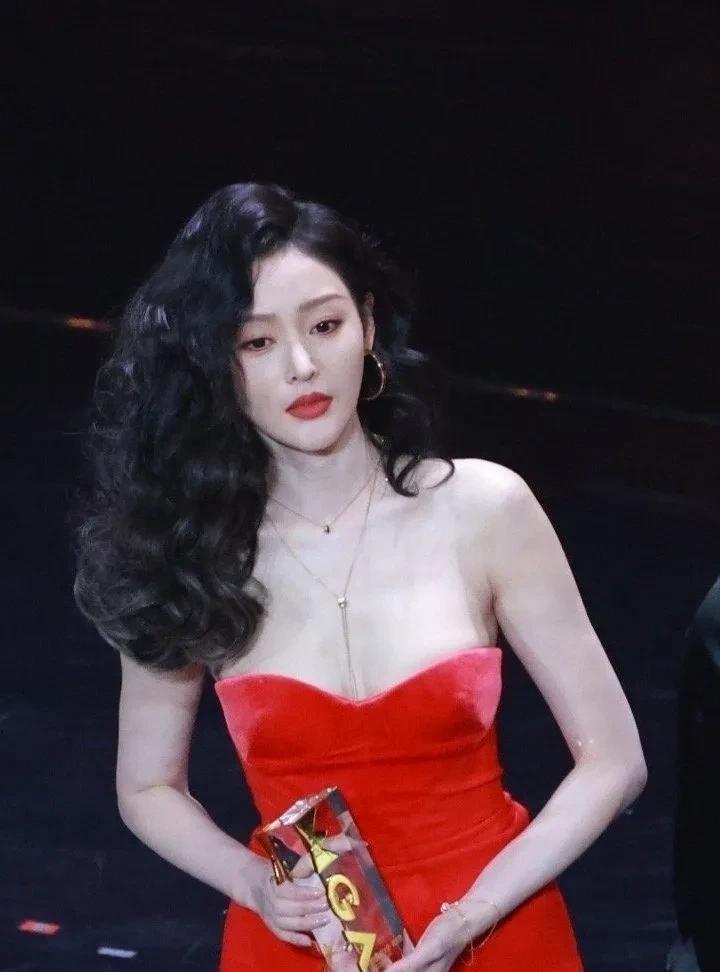 张天爱一袭红裙封神!皮肤白到发光,卷发配红唇,领奖时腰臀比逆天,这身材直接把镜头