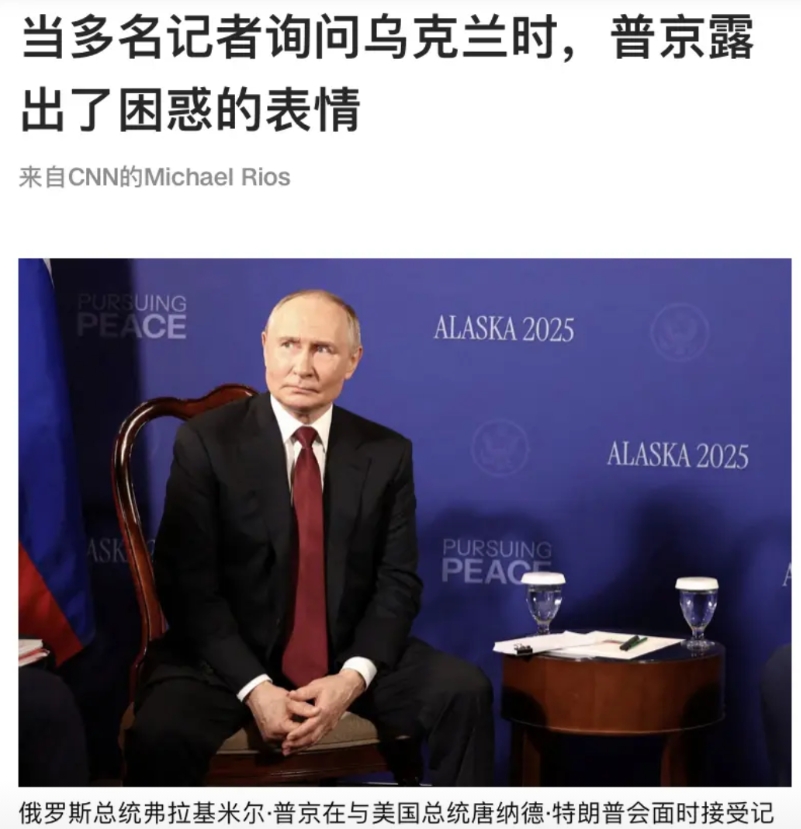 普京没回答任何问题,表情挺丰富。 普京抵达阿拉斯加后,当记者在机场对他和美国总统特朗普大喊提问时,普京没有回答他是否会同意停火。 当被问及他是否会“停止袭击平民”时,普京似乎表示他听不见这个问题。 在美军基地会议室落座后,媒体在现场有一段时间拍照。 普京依然没有回答记者关于乌克兰战争的问题。 当多名记者开始大声提问时,普京似乎露出了困惑的表情。 比如有人问他是否会同意停火?他是否会承诺不针对更多平民?以及为什么特朗普现在应该相信他的话? 这些都没回应。不过他的表情丰富,时而微笑、时而困惑、时而平静。