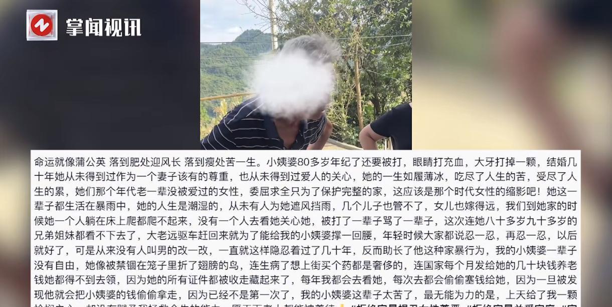 “这就是命啊!”8月13日,贵州,一位80多岁的老太为了看望过世的父母,外出了两天,回到家后却被老伴家暴,导致眼睛被打充血,牙齿都掉了一颗!老太的娘家人看不下去,全家人来给她撑腰,并且报了警,网友:不是所有老人过了一辈子都有感情! 现在很多老一辈的爱情虽然让人羡慕,但是不可否认的是也有很少一部分老人并不像那么美好,甚至打骂了妻子一辈子,连老了都不准她回娘家看望过世父母! 这位老太已经80多岁了,据她的家人所说,自从嫁过来之后,妻子就经常遭到丈夫的家暴,但她那个年纪的人根本不知道什么是反抗,结果就是一次次的助长了丈夫的气焰。 就在前几天,老太得知了家里人要为过世的父母立碑,她太久没回娘家了,便想去看一眼,结果在去的当天,老太就不断接到了老伴打来的电话,电话里疯狂辱骂她。 到了第二天老太坐车回去之后,竟遭到了老伴的家暴,眼睛和牙齿都受了伤,娘家人不放心便打算来看看,结果这才得知大爷收走了老太的手机,不让她和家里人联系。 这一幕直接让老太的娘家人怒了,他们几乎一大家子全部都来讨要个说法,甚至还报了警,大爷似乎还不知道自己的行为是很过分的,可见他在家里已经不是第一次这么做了! 对于那个时代的女性来说,能保住这个家不分崩离析,就是她们的愿望,为了实现这个目标,她们甚至在被丈夫家暴之后,都一直在隐忍! 信息来源:《80岁老人因去看望过世父母被家暴,兄弟姐妹带全体娘家人撑腰,家人怒报警》掌闻视讯