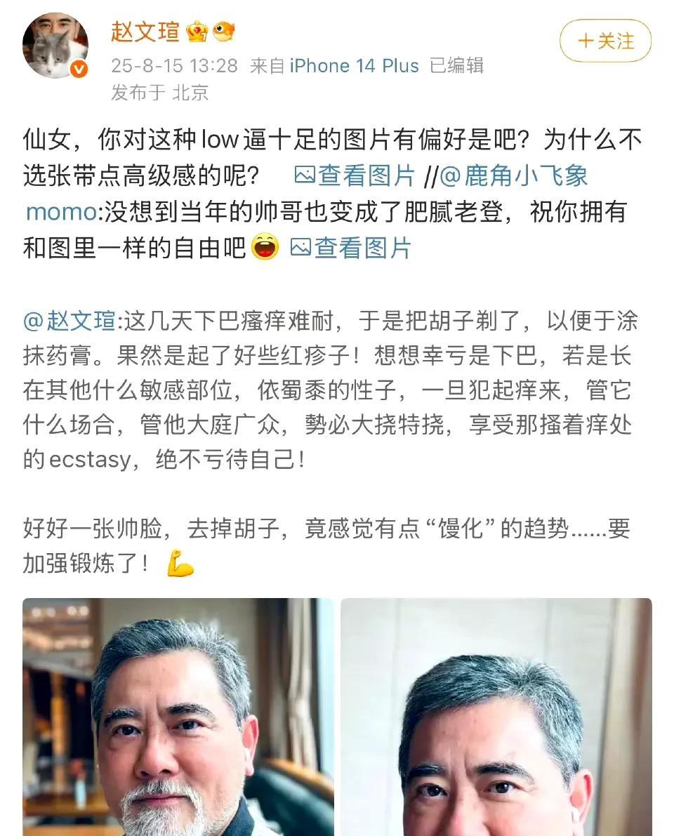赵文瑄,被无数网友质疑了! 8月15日,著名演员赵文瑄,因为一篇看似支持武汉大学肖同学的博文,很网友对他非常不满,纷纷发表各种评论质疑他有问题。 而赵文瑄丝毫不给网友任何面子,开始用犀利的言论回复各种网友的留言。 赵文瑄非常自信,用老了的法拉利形容自己,还称有女粉丝说他长成这样就是犯了勾引罪。 赵文瑄的每一次发言都能是热搜话题,他是要转型哲学家了吗? 图5为图3网友所发图片 图6为图3赵文瑄所发图片