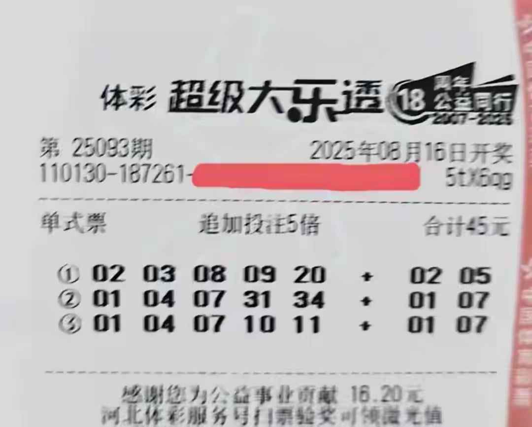 有空的时候,我就喜欢看看别人晒的大乐透彩票。你瞅那些彩票,一张一张的,里面全是大伙对好日子的盼头。每一组号码,在买彩票的人心里,那都是对幸运的一种特别的想法。 有些人可认真了,天天研究号码的走势,就想着从那些复杂的规律里,找出能发财的秘诀;还有些人就随便选几个数,把能不能中奖这事交给老天爷决定。不管是哪种选号的法子,都能看出大家对生活的热爱,还有对以后的期待。 不过呢,看这些晒票的时候,咱得心里有数,保持理智。彩票说白了就是个乐子,能让咱有点盼头,乐呵乐呵,但可不能把它当成改变命运的唯一办法。咱可不能把所有希望都放在一张小小的彩票上,更不能脑子一热,就花好多钱去买。 生活就像一场特别长的旅行,路上有让人高兴的事儿,也有让人闹心的挫折。咱得实实在在的,靠自己努力去把日子过好,别老想着靠那没影的运气。 理性看待彩票,就是把它当成生活里的一点小佐料,不能让它成了生活的全部。买彩票的时候,得看看自己有多少钱,合理地花钱,别让买彩成了自己的负担。 咱也得知道,中奖的概率低得很,就算没中,也别垂头丧气的。毕竟在等开奖的过程中,咱也有了盼头,也挺开心的。