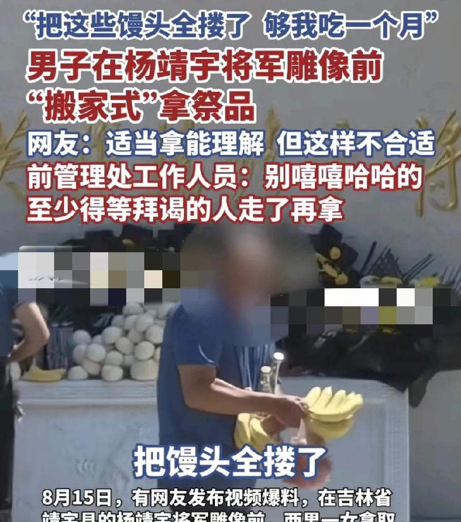 近日,吉林省靖宇县一将军雕像前有两男一女把雕像前的祭品包括两挂香蕉,一袋苹果和几瓶白酒就这样拿走,很多。网友觉得很不合适,可以适当拿一点,毕竟是食品放久会坏掉,但是一次性拿那么多。工作人员表示之前一直都没有限制旁人可以拿走这些祭品,拿走可以理解,但是要等别人拜祭完走了之后再拿走,拿的时候也别嘻嘻哈哈的,毕竟这是一种信仰,老将军是饿死的。