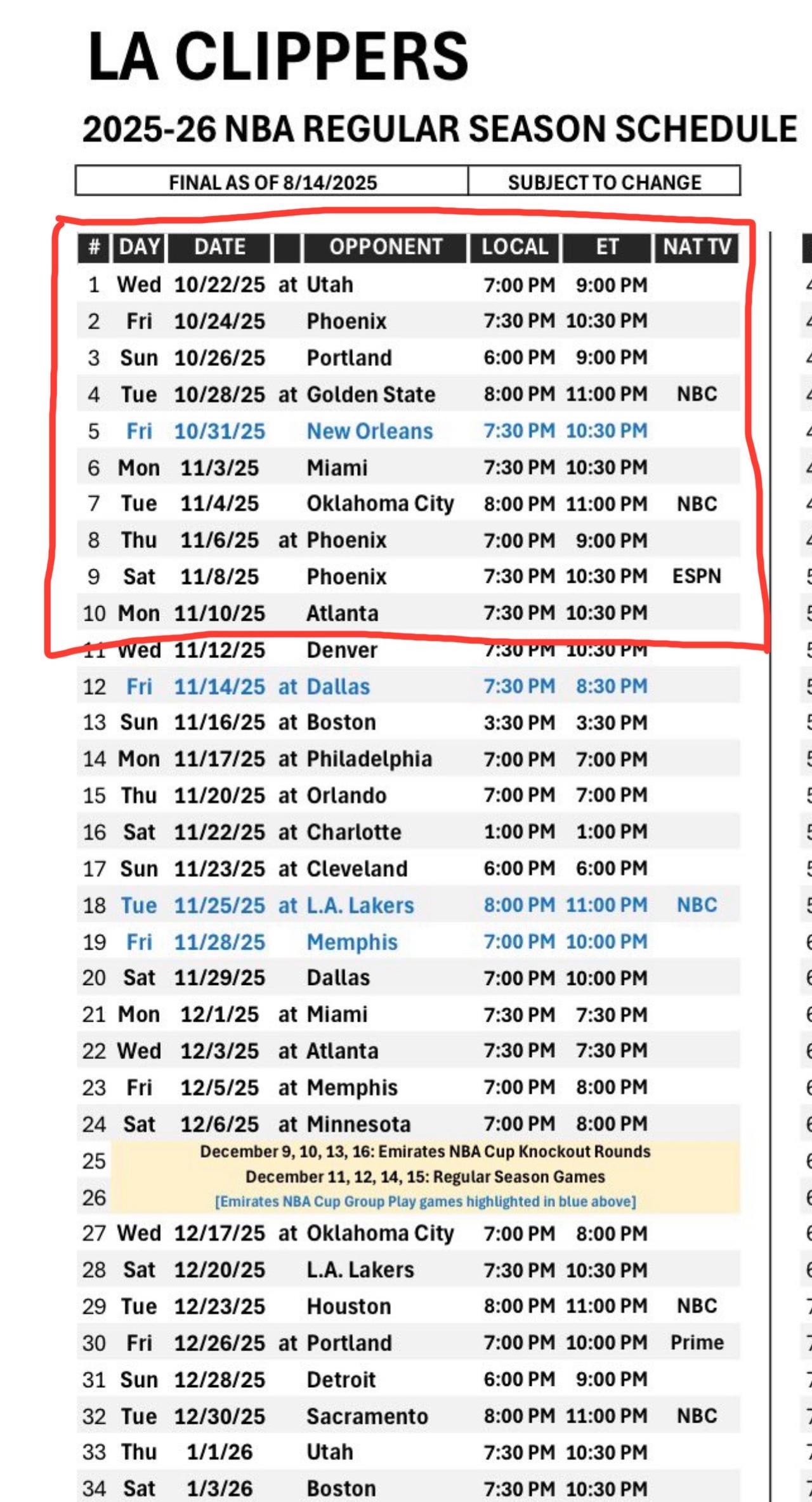 快船25-26赛季前10场对手依次如下: 客场打爵士, 主场打太阳, 主场打开拓者, 客场打勇士, 主场打鹈鹕, 主场打热火, 主场打雷霆, 客场打太阳, 主场打太阳, 主场打老鹰! 可以说,前十场比赛里,除了雷霆之外,其他球队,快船都在实力上占据优势!整体上面临的挑战是比较低的,如果打完这10场,快船取得9胜1负的战绩,一点也不用惊讶! 甚至发挥好,在主场赢了卫冕冠军,似乎也不全是太大的爆冷! 如果能在开局打出一波连胜,显然有利于球队进一步提升信心,在激烈的西部排名争夺中占得先机!