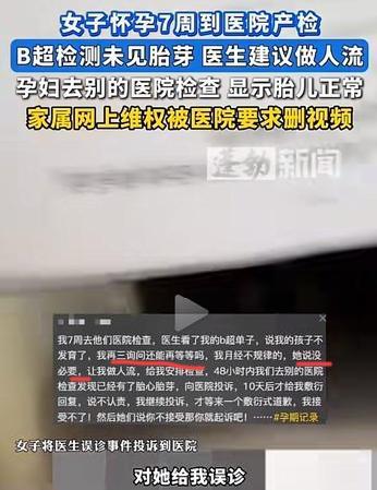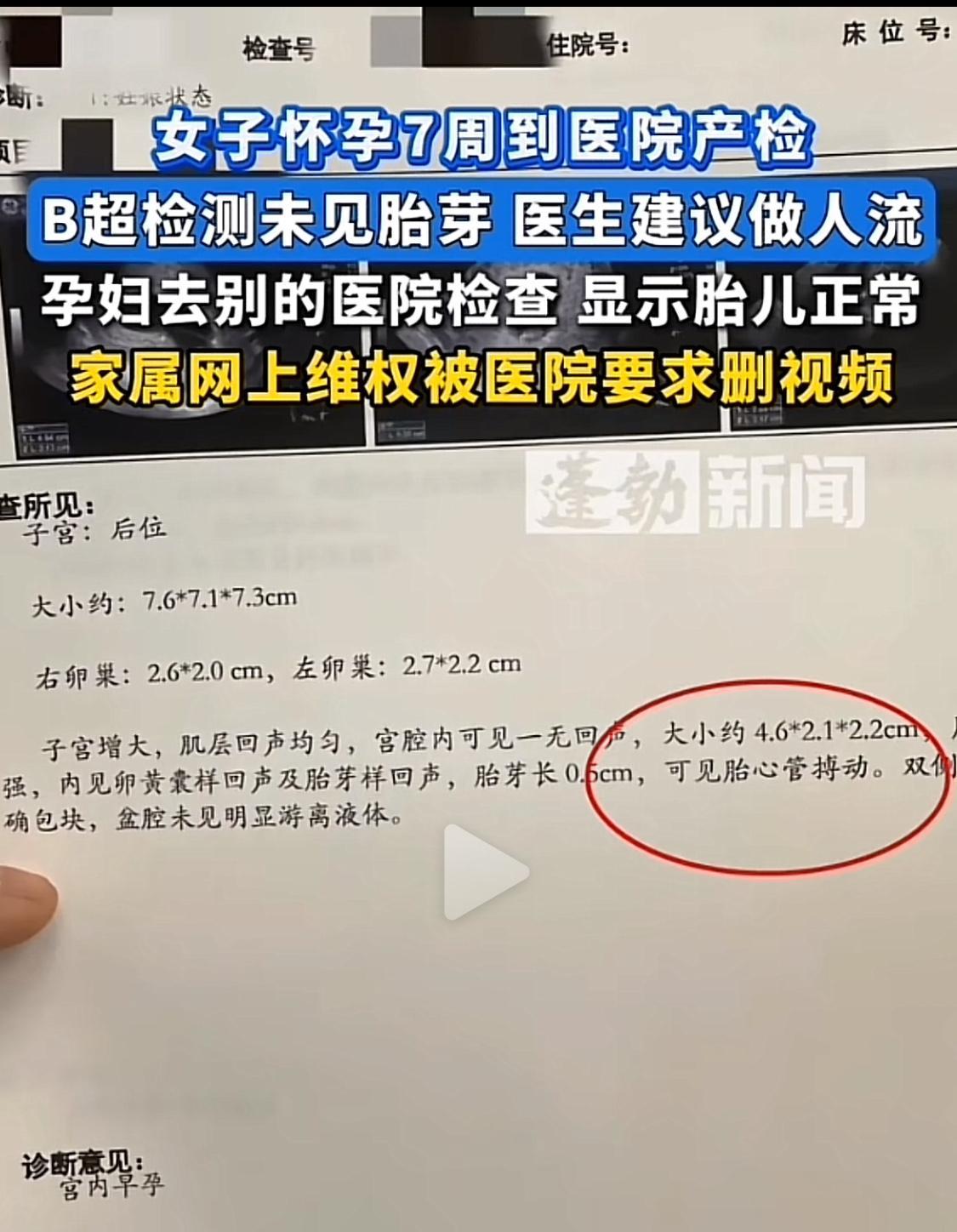 离了大谱!山东一女子怀孕七周去做产检,却被告知“未见胎芽”医生建议立刻做人流!女子不甘心,于是换了一家医院检查,却显示胎儿完全正常! 吴女士(化名)和丈夫自结婚以来,两人感情一直不错。 她的公婆待她如亲生女儿,对她关爱备至,经常在日常生活中为她提供帮助和支持,这让她在婚后感到非常幸福和温暖。 直到有一天,吴女士突然感到身体出现了一些异样的变化,她感觉到有些疲劳,情绪也变得有些波动,最让她疑惑的是,自己本该按时来的月经却迟迟没有来。 经过一番自我判断后,她心里突然升起了一个大胆的猜测:自己是不是怀孕了? 她决定做一个试纸测试,结果显示两条线清晰显现,吴女士激动不已。 吴女士忍不住告诉了丈夫,两人一起跳跃欢呼,怀孕的消息让全家人都沉浸在喜悦之中。 公婆立刻开始为即将到来的宝宝准备婴儿床、衣物和玩具,期待着小生命的到来。 可是,这一切的美好幻想在医院的一次B超检查中被戳破了。 当医生递给她检查单时,吴女士的心情从云端跌入了深渊。 检查单上的诊断让她完全无法接受:“宫内早孕,未见胚芽”。 医生看着报告,语气平淡地告诉她:“建议尽快做流产手术,趁着月份小,对身体的伤害不大。” 那一刻,吴女士的心彻底沉了下去。 她和丈夫互相对视,泪水在眼眶里打转,所有的期望和幸福瞬间变得苍白无力。 可是,作为母亲,吴女士心里始终有一个声音告诉她,这个决定太过草率。 她不想放弃这个孩子,哪怕只有一线希望。 吴女士和丈夫商量后,决定换一家医院重新检查。 虽然心里依然充满了担忧,但她抱着最后的希望,踏进了第二家医院。 在第二家医院,检查结果完全不同。 报告显示胎儿发育得很好,不仅能看到胎芽,还能监测到正常的胎心搏动。 这个结果让吴女士确认,自己腹中的小生命是健康的,也让她对自己当初的决定感到庆幸。 拿着两份截然不同的报告,吴女士夫妇回到第一家医院,想讨个说法。 他们没想到,院方的态度非常恶劣,坚称自己的检查和诊断没有任何问题。 在吴女士多次投诉后,医院给了一个敷衍的道歉,她无法接受。 沟通彻底失败,院方最后扔下一句话:“你要是不接受,就去起诉吧!”这句话彻底关上了协商的大门。 无奈之下,吴女士选择将自己的全部经历发布到网络上,希望能得到一个公正的回应。 这件事在网上迅速传开,引起了轩然大波。 网友们纷纷谴责医院,认为这种行为几乎酿成悲剧,应当被定为医疗事故。 许多人也分享了自己类似的经历,对吴女士的遭遇感同身受。 网络上的巨大压力,终于让医院坐不住了,他们再次联系了吴女士。 可是,他们打来电话的目的,并不是为了真诚道歉或解决问题,而是强硬地要求吴女士删除视频,进行下架处理。 这个举动,比那份错误的诊断报告更伤人心。 一个生命险些因为一份草率的报告而逝去,事后寻求解释却只得到强硬的回应和息事宁人的要求。 其实大家心里都明白,医疗有风险,检查也可能有误差,但比技术失误更可怕的,是失去那份本该有的责任与温度。 这件事,你怎么看?