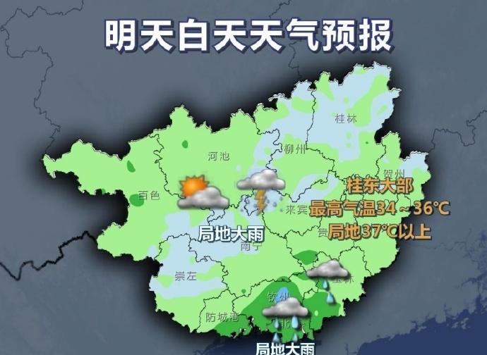 #广西天气# 【明天白天桂东有高温!明晚起广西雨势再度增多增强】今天晚上,防城港、钦州、北海等市有阵雨或雷雨、局地大雨,其它地区多云到晴,局地有阵雨或雷雨。 明天白天,防城港、钦州、北海、玉林、贵港等市有小到中雨、局地大雨或暴雨,其它地区多云有阵雨或雷雨、局地大雨。桂东大部最高气温34~36℃、局地37℃以上。 南宁市:今天晚上多云,明天白天多云有阵雨或雷雨、局地大雨,偏东风2级,最低气温25℃,最高气温34℃。 17日晚上到18日白天,桂南、桂东有中到大雨、局地暴雨或大暴雨并伴有短时雷暴大风等强对流天气,其它地区有小到中雨、局地大雨。 18日晚上到19日白天,桂南、桂西有大雨到暴雨、局地大暴雨并伴有短时雷暴大风等强对流天气,其它地区有小到中雨、局地大雨。 北部湾海面:今天晚上到明天白天,大雨到暴雨,偏东风5~6级、阵风7~8级;17日晚上到18日白天,大雨到暴雨、局地大暴雨,旋转风5~6级、阵风7~8级;18日晚上到19日白天,大雨、局地暴雨,偏南风5~6级、阵风7级,雷雨时有短时大风。合浦到东兴沿海各地台风警报站,所挂的强风信号一号风球不改变。(广西气象台16日17时发布预报)