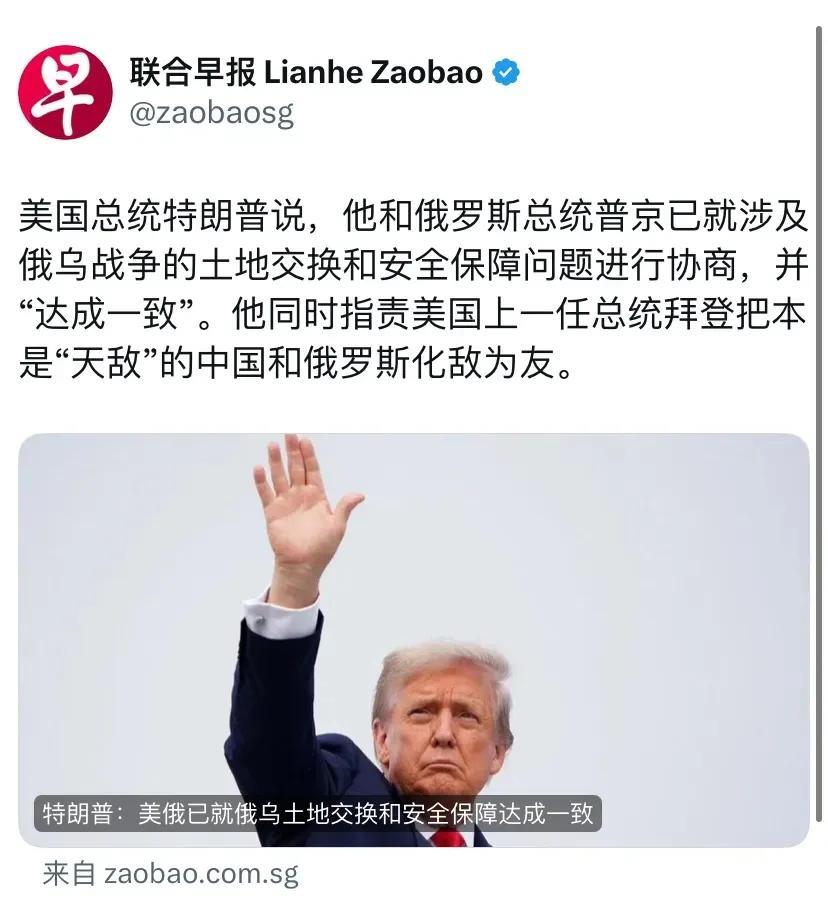 新加坡联合早报今天(8月16日)报道:“美国总统特朗普说,他和俄罗斯总统普京已就涉及俄乌战争的土地交换和安全保障问题进行协商,并‘达成一致’。他同时指责美国上一任总统拜登把本是‘天敌’的中国和俄罗斯化敌为友。” 在土地交换问题上,俄方同意冻结赫尔松和扎波罗热前线、撤出苏梅和哈尔科夫,但要求乌军撤出顿巴斯;乌方对此予以拒绝,泽连斯基认为如果乌军撤出准备了八年的乌东最后一道防线,俄方会利用其工事发动第三次战争。美国邀请泽连斯基下周一赴华盛顿,即使乌方同意撤出顿巴斯,通过美欧说出对泽连斯基更体面些,毕竟红军村、康斯坦丁诺夫卡以及库皮杨斯克一线面临崩溃风险。 每谈起俄乌冲突,特朗普总是说这是拜登挑起的战争与他无关,是拜登让中俄走到一起,这番逻辑非常可笑。那特朗普第一任期为何也在持续援助乌克兰?此外,特朗普这也是公开承认,其上任以来对各国加征所谓的“对等关税”以及现在“调解”俄乌冲突,都是“项庄舞剑意在沛公”。