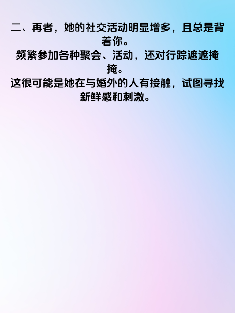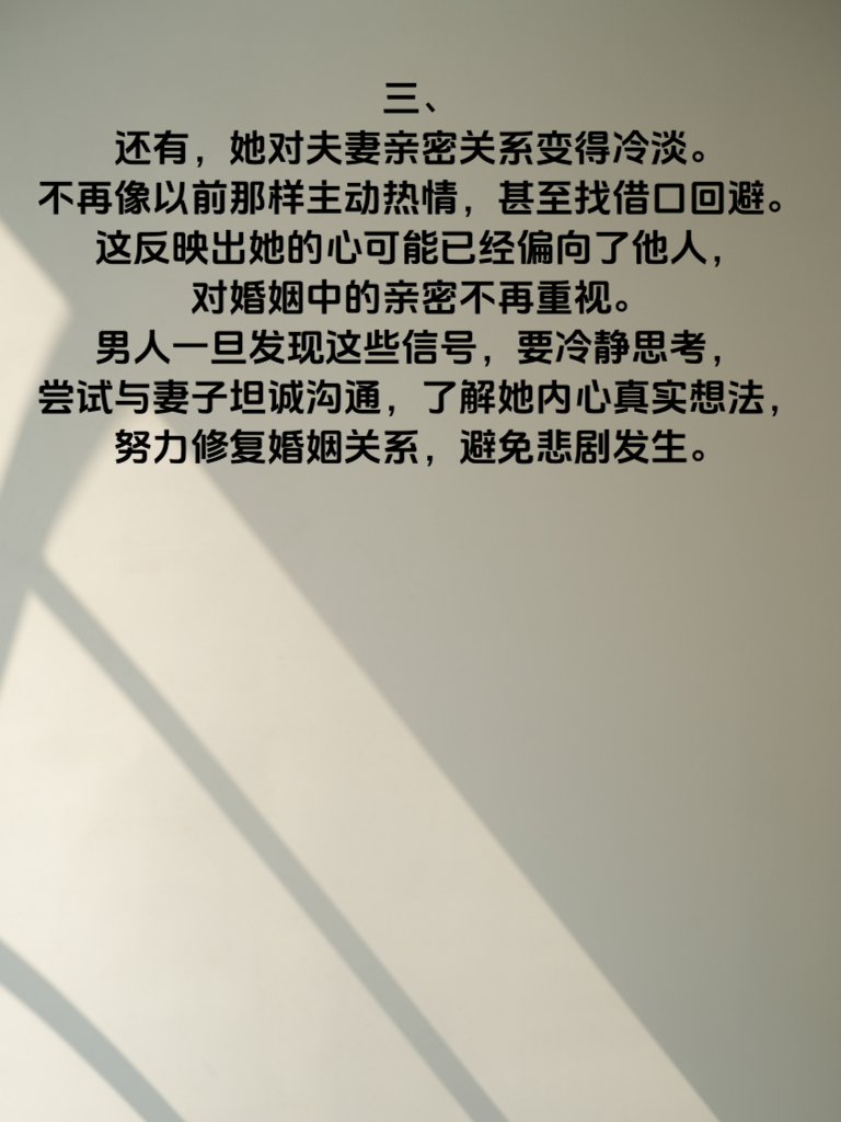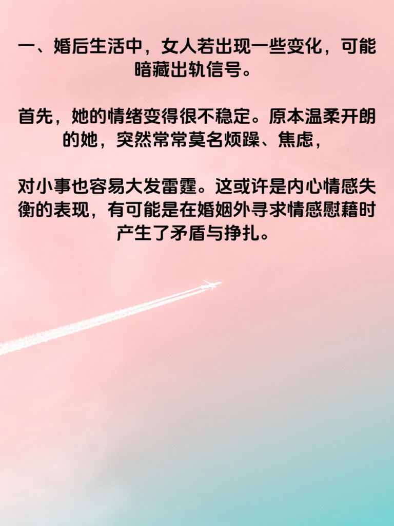 一、婚后生活中,女人若出现一些变化,可能暗藏出轨信号。首先,她的情绪变得很不稳定。原本温柔开朗的她,突然常常莫名烦躁、焦虑,对小事也容易大发雷霆。这或许是内心情感失衡的表现,有可能是在婚姻外寻求情感慰藉时产生了矛盾与挣扎。 二、再者,她的社交活动明显增多,且总是背着你。频繁参加各种聚会、活动,还对行踪遮遮掩掩。这很可能是她在与婚外的人有接触,试图寻找新鲜感和刺激。 三、还有,她对夫妻亲密关系变得冷淡。不再像以前那样主动热情,甚至找借口回避。这反映出她的心可能已经偏向了他人,对婚姻中的亲密不再重视。男人一旦发现这些信号,要冷静思考,尝试与妻子坦诚沟通,了解她内心真实想法,努力修复婚姻关系,避免悲剧发生。