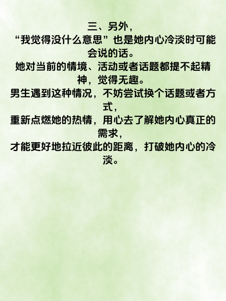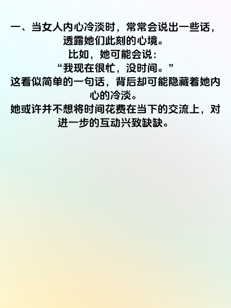 一、当女人内心冷淡时,常常会说出一些话,透露她们此刻的心境。比如,她可能会说:“我现在很忙,没时间。”这看似简单的一句话,背后却可能隐藏着她内心的冷淡。她或许并不想将时间花费在当下的交流上,对进一步的互动兴致缺缺。 二、还有可能她说:“随便,都行。”这种回应缺乏热情与主见,表明她对事情并不关心,内心处于一种比较淡漠的状态。这时候男生就要反思,是不是自己的提议没有引起她的兴趣。 三、另外,“我觉得没什么意思”也是她内心冷淡时可能会说的话。她对当前的情境、活动或者话题都提不起精神,觉得无趣。男生遇到这种情况,不妨尝试换个话题或者方式,重新点燃她的热情,用心去了解她内心真正的需求,才能更好地拉近彼此的距离,打破她内心的冷淡。