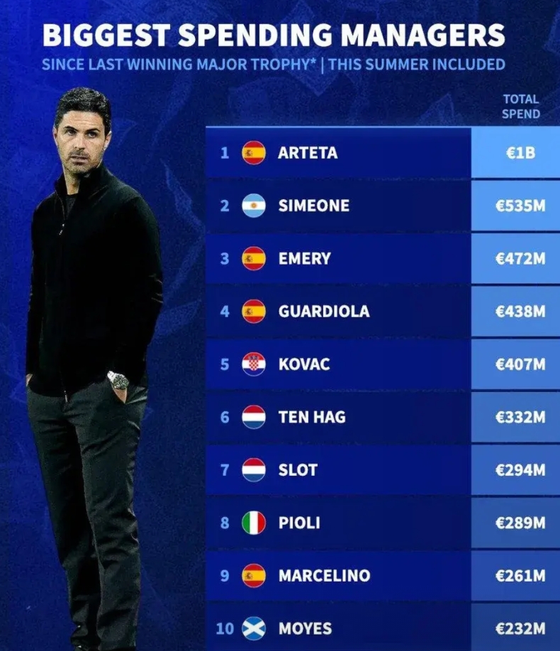 阿尔特塔:执教阿森纳6年,1足总杯、1社区盾杯,花费超10亿欧!