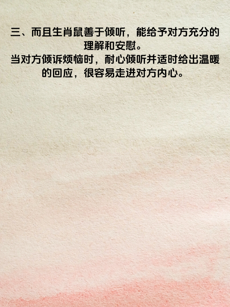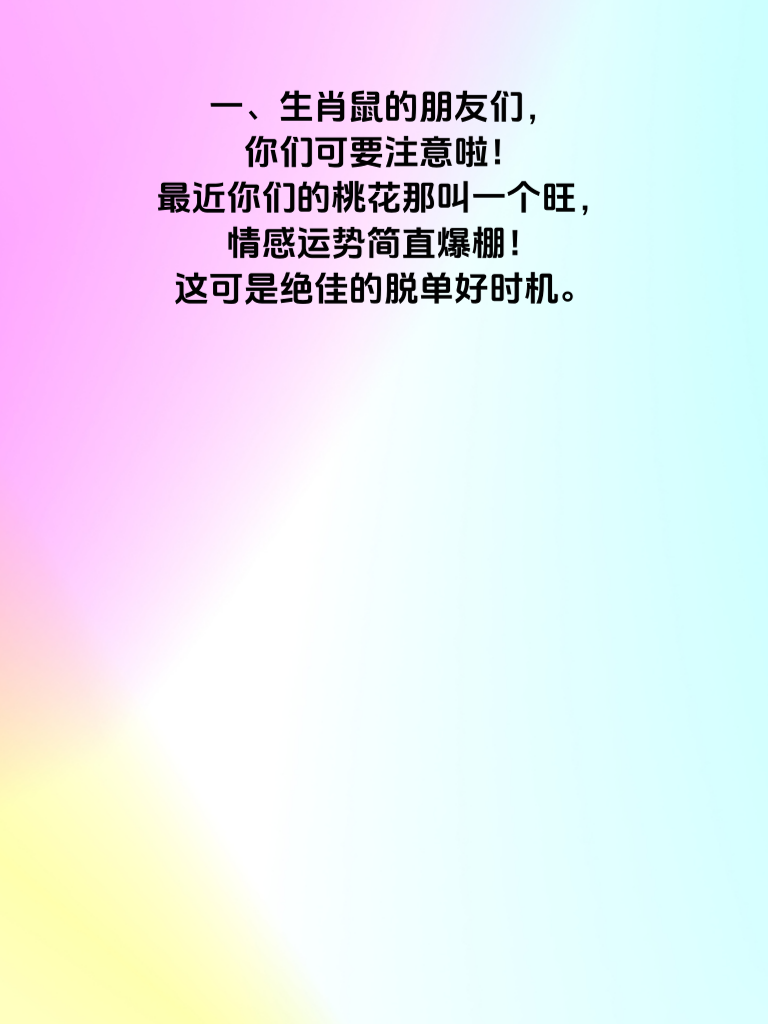 一、生肖鼠的朋友们,你们可要注意啦!最近你们的桃花那叫一个旺,情感运势简直爆棚!这可是绝佳的脱单好时机。 二、在与人交往中,生肖鼠的细腻心思能敏锐捕捉到对方的喜好。比如了解到对方喜欢某部电影,下次约会就可以安排一起去看,这贴心的举动会让对方好感倍增。 三、而且生肖鼠善于倾听,能给予对方充分的理解和安慰。当对方倾诉烦恼时,耐心倾听并适时给出温暖的回应,很容易走进对方内心。 四、社交场合中,生肖鼠的活泼开朗会吸引众多目光。主动与不同的人交流互动,扩大自己的社交圈,遇到心仪对象的几率也大大增加。 五、抓住这难得的好运势,大胆去追求自己喜欢的人吧。用真心和独特的魅力,收获美好的爱情,让情感生活绚丽多彩起来。