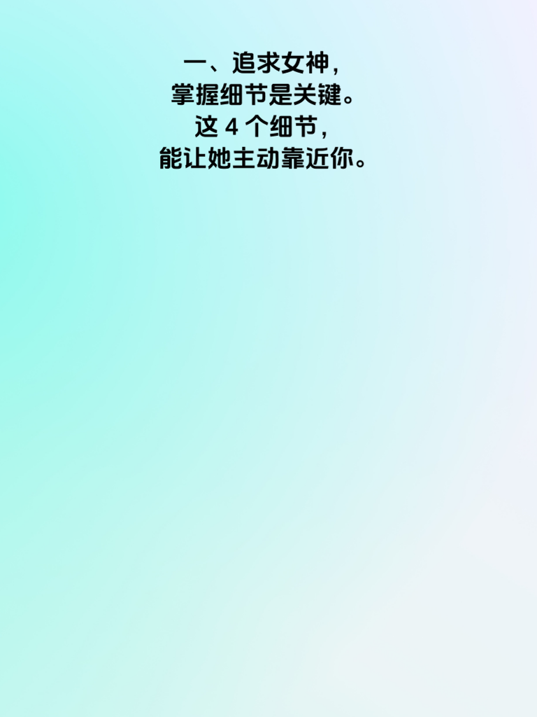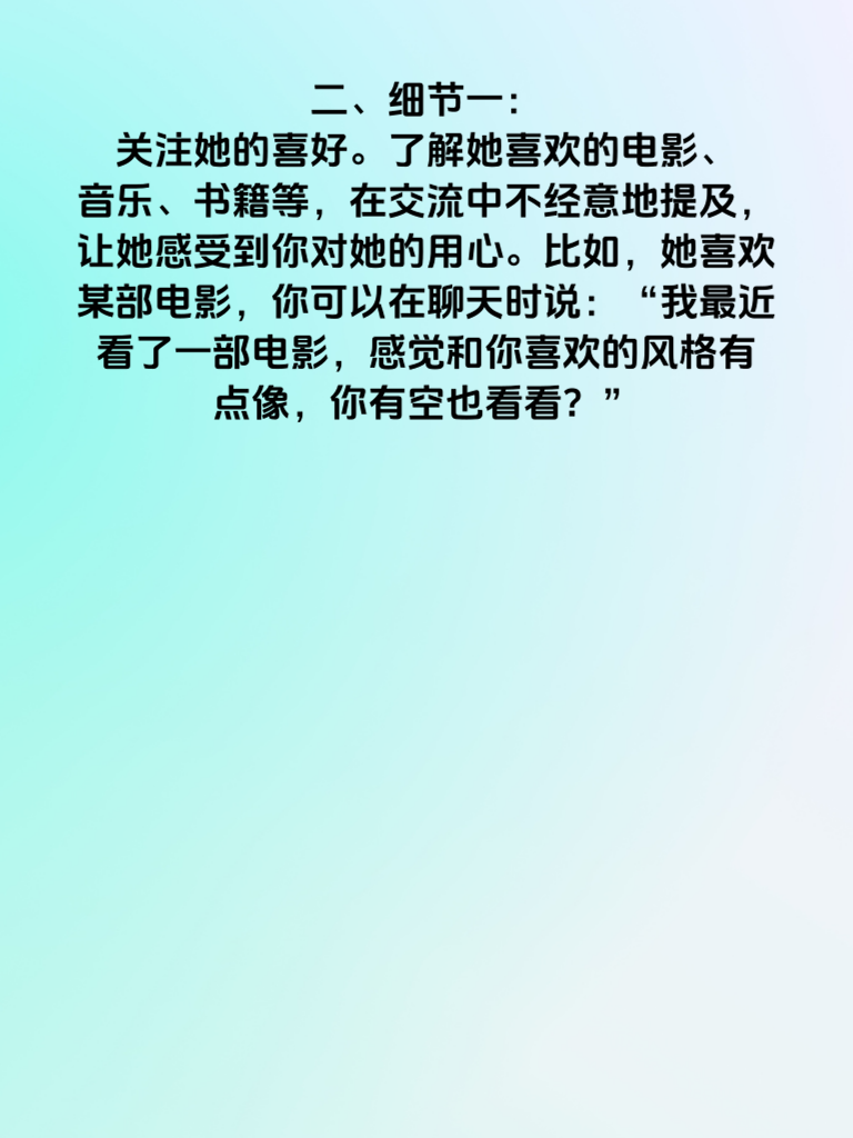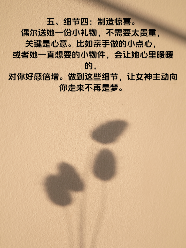 一、追求女神,掌握细节是关键。这4个细节,能让她主动靠近你。 二、细节一:关注她的喜好。了解她喜欢的电影、音乐、书籍等,在交流中不经意地提及,让她感受到你对她的用心。比如,她喜欢某部电影,你可以在聊天时说:“我最近看了一部电影,感觉和你喜欢的风格有点像,你有空也看看?” 三、细节二:保持真诚的态度。不要试图伪装或夸大自己,真实的你才最有魅力。真诚地对待她的喜怒哀乐,在她需要时给予真心的安慰和支持。 四、细节三:注重自身形象。干净整洁的外表、自信的举止会加分不少。穿着得体,走路挺胸抬头,展现出积极向上的精神风貌。 五、细节四:制造惊喜。偶尔送她一份小礼物,不需要太贵重,关键是心意。比如亲手做的小点心,或者她一直想要的小物件,会让她心里暖暖的,对你好感倍增。做到这些细节,让女神主动向你走来不再是梦。