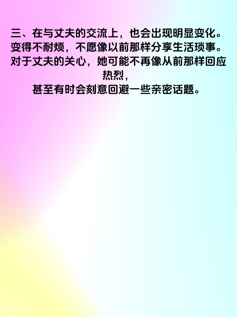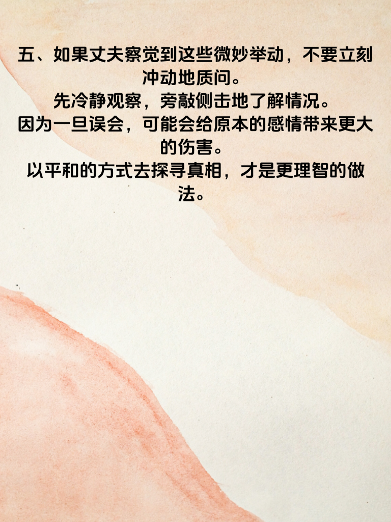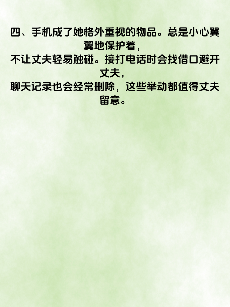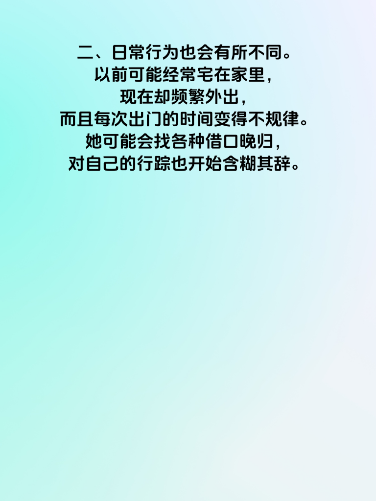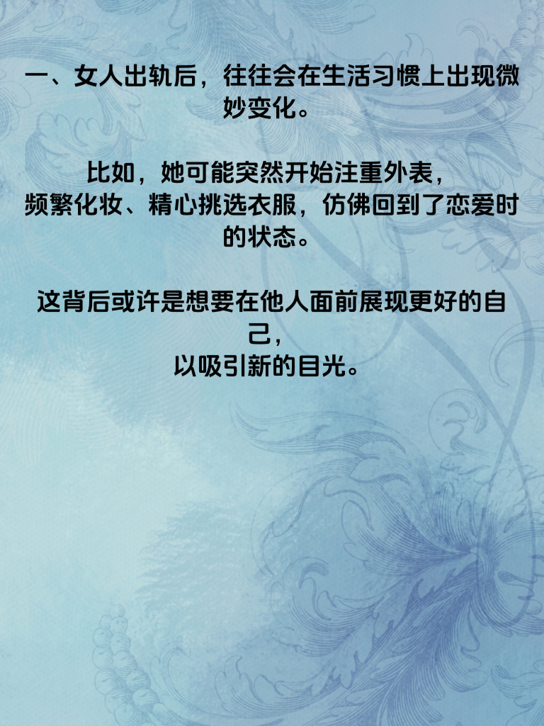 一、女人出轨后,往往会在生活习惯上出现微妙变化。比如,她可能突然开始注重外表,频繁化妆、精心挑选衣服,仿佛回到了恋爱时的状态。这背后或许是想要在他人面前展现更好的自己,以吸引新的目光。 二、日常行为也会有所不同。以前可能经常宅在家里,现在却频繁外出,而且每次出门的时间变得不规律。她可能会找各种借口晚归,对自己的行踪也开始含糊其辞。 三、在与丈夫的交流上,也会出现明显变化。变得不耐烦,不愿像以前那样分享生活琐事。对于丈夫的关心,她可能不再像从前那样回应热烈,甚至有时会刻意回避一些亲密话题。 四、手机成了她格外重视的物品。总是小心翼翼地保护着,不让丈夫轻易触碰。接打电话时会找借口避开丈夫,聊天记录也会经常删除,这些举动都值得丈夫留意。 五、如果丈夫察觉到这些微妙举动,不要立刻冲动地质问。先冷静观察,旁敲侧击地了解情况。因为一旦误会,可能会给原本的感情带来更大的伤害。以平和的方式去探寻真相,才是更理智的做法。