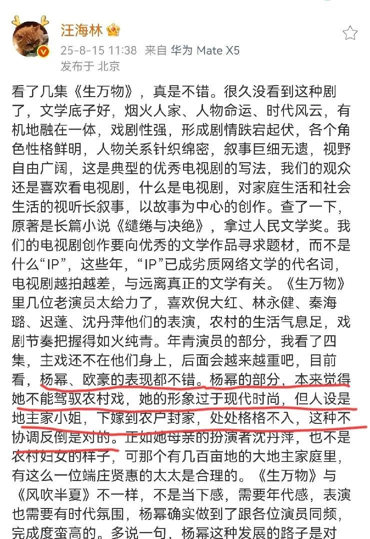 感觉编剧汪海林今年还挺爱杨幂的。 电影《酱园弄》上映的时候,他夸杨幂,称“杨幂表现好于赵丽颖”。 杨幂主演的《生万物》开播后,他也特意发文表扬了杨幂,称她表演得不错。 接连夸奖杨幂两次的汪海林不知道还记不记得去年你曾狠踩过人家呀?去年你说人家杨幂演戏是“一惊一乍的”,说人家用力过猛。 再往前,给人家颁金扫帚奖,说人家贿赂评委撤销金扫帚………… 这些汪海林是都忘了么? #我的宝藏兴趣#