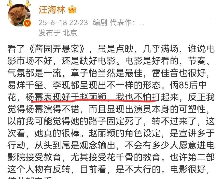 感觉编剧汪海林今年还挺爱杨幂的。 电影《酱园弄》上映的时候,他夸杨幂,称“杨幂表