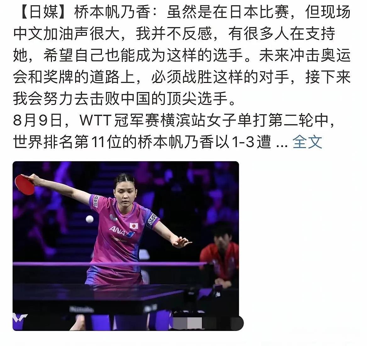 是什么让桥本帆乃香羡慕孙颖莎了? 原来是日本横滨冠军赛, 大家都为孙颖莎加油, 让桥本懵了, 这可是日本, 我才是主场, 没想到孙颖莎影响力这么大, 在日本也有这么多粉丝! 不过桥本表示, 他她不反感, 自己要打败莎莎, 成为这样的人!