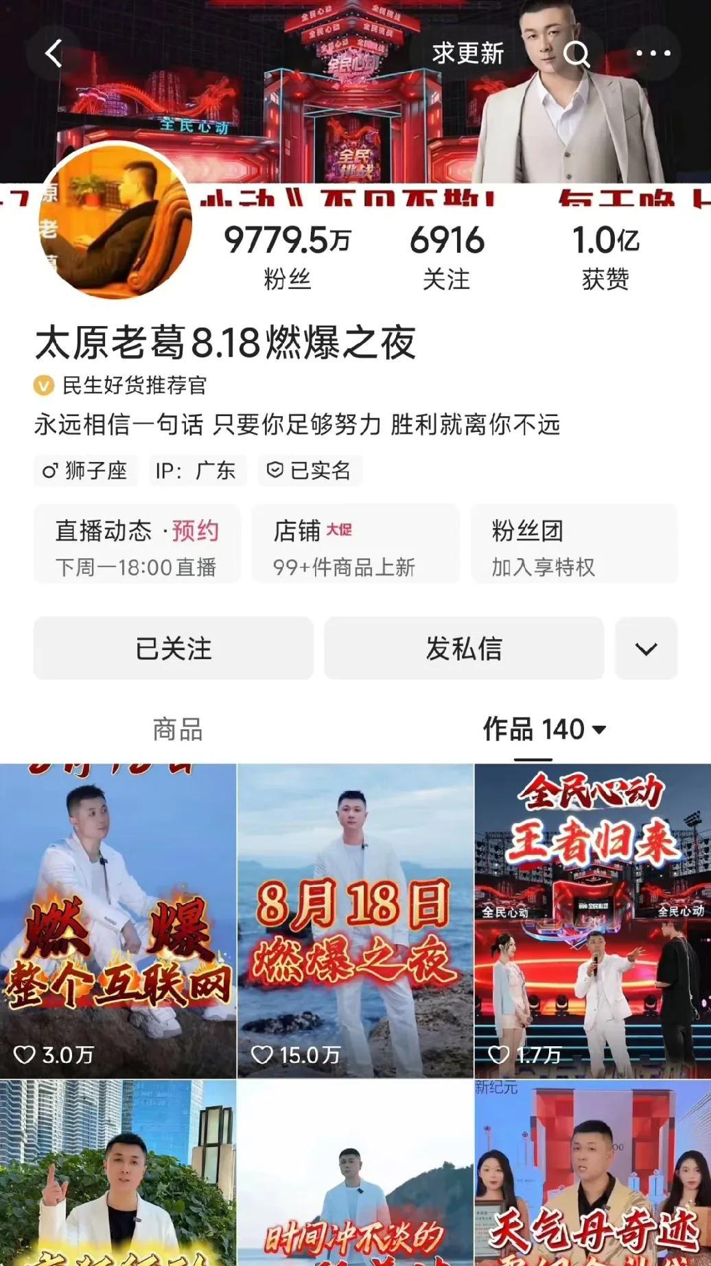 辛巴身陷“棉密码硫脲门”事件音讯全无,连818这么重大的日子也无法开播,太原老葛已改名为“太原老葛8.18燃爆之夜”,乘胜追击宣传8月18号的活动! 就在去年,一场暗战,太原老葛808活动半路夭折,忍受了奇耻大辱,以老葛的性格睚眦必报,今年要在818办活动一雪前耻!老葛目前粉丝已经9779.5万了,这要是在818当天破亿,无异于杀人诛心啊!