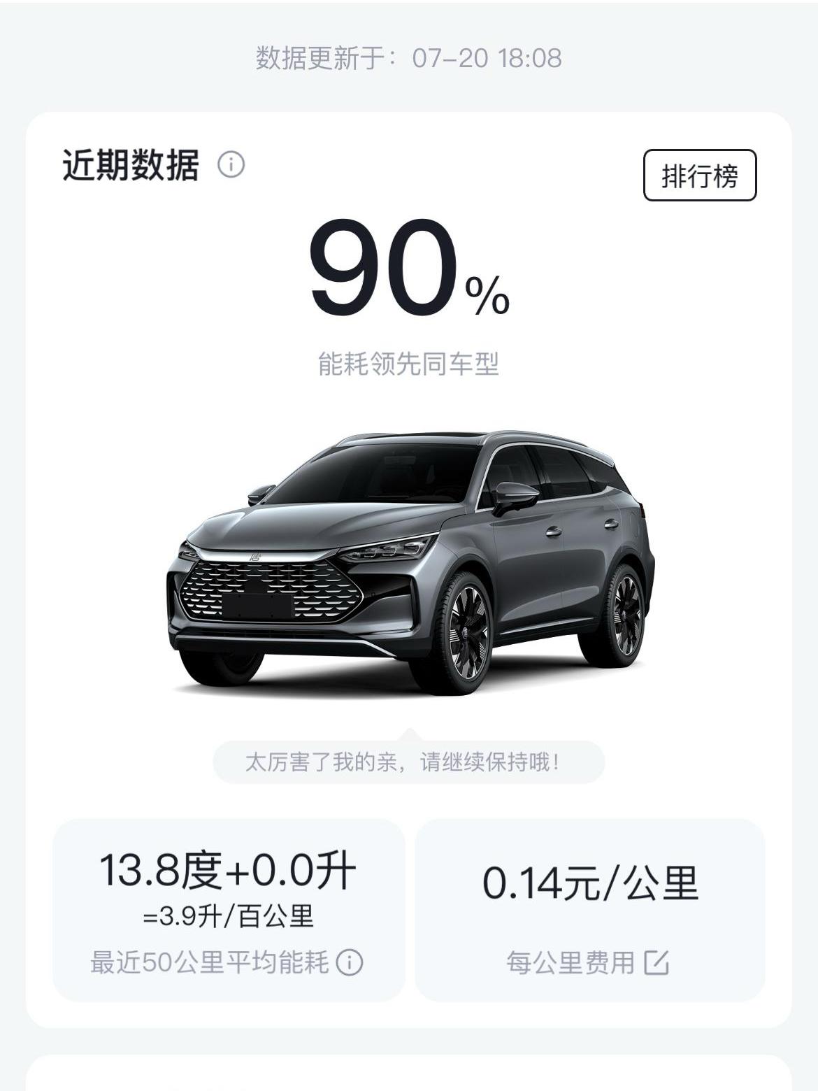 各位车友,我是24款唐DMI荣耀版的老车主了。今天不聊别的,就想跟大伙儿唠唠我这台车的电耗那点事儿。我这唐DMI荣耀版,最低的时候开到过每百公里13.8度电,现在是真难再回到那个“巅峰状态”了,不过没关系,把我当时咋开的经验分享出来,说不定对大家有点启发。 1⃣ECO模式是基础,脚法得温柔 👉要说省电,ECO模式必须是首选。我那会儿基本就没离开过ECO。开车嘛,尽量别猛踩油门,那种“窜”出去的感觉是爽,但电耗也跟着上去了。匀速行驶是最省电的,我感觉经济时速大概在60到80公里每小时这个区间,溜着走,瞬时电耗看着就喜人。 2⃣红绿灯提前松脚,动能回收别太狠 👉遇到红绿灯或者需要减速的时候,千万别等快到跟前了再一脚刹车踩下去。提前松油门,让车子滑行,动能回收就能派上用场,多少能回点电。不过动能回收这个东西,我不建议调到最大。最大的话,那拖拽感太强了,开着不舒服,像有人在后面拽你似的,坐我车的朋友有的还会觉得晕乎乎的,驾驶感受大打折扣,得不偿失。找个自己能接受的力度就行。 3⃣胎压打高点,空调温度设适中 👉还有个小秘诀,就是胎压。在厂家建议的合理范围内,把胎压打高一点点,轮胎跟地面的接触面积小了,摩擦力也会小一点,理论上能省点电。夏天开空调也是个耗电大户,温度别设太低,24到26度之间我觉得挺舒服,也不至于太费电。车里那些暂时不用的电子设备,比如座椅通风加热、氛围灯啥的,不用就关掉,别让它们白白耗电。 ✍️现在开车没那么刻意去追求极致低电耗了,毕竟开车还是为了方便舒服。但这些小习惯养成了,日常开下来电耗也不会太高。希望这些经验,对各位唐DMI的车友们有点帮助。