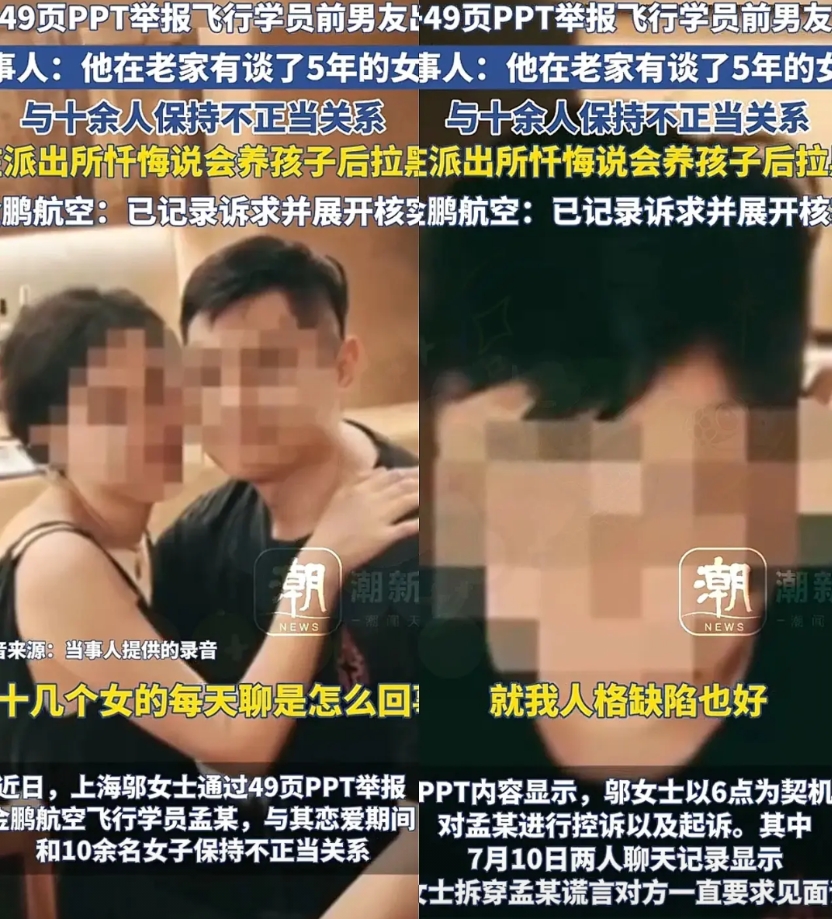 姐妹们,这瓜吃得我血压直飙!上海38岁的邬女士,和32岁的飞行学员孟先生谈了恋爱,结果怀了孕才发现,对方不仅有个谈了5年的女友,还同时交往着十几个姑娘! 邬女士找上门质问,孟先生直接拉黑;派出所调解时,他轻飘飘一句“我有人格缺陷”就想打发;更恶心的是,邬女士要求负责,他转头就在公司群骂人家是“仙人跳”,说孩子不是他的。最后邬女士被逼得没办法,甩出49页PPT实名举报,这股子决绝劲儿,真让人心疼又佩服。 说真的,感情里最忌讳的就是欺骗。那些把感情当游戏的人,迟早会栽跟头。可话又说回来,咱们在恋爱里也得擦亮眼睛,别被表象迷惑。 要是你遇到这种事,会像邬女士这样硬刚吗?