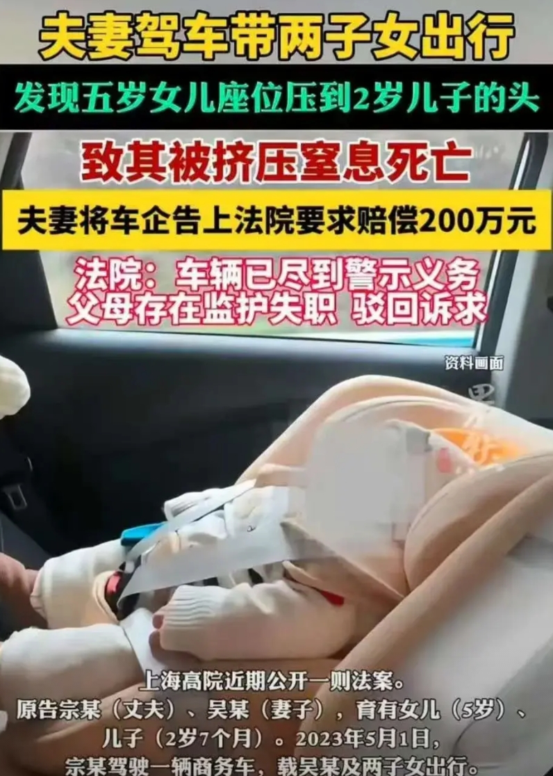 上海一对夫妇开车带儿女出行。5岁的女儿在第二排摆弄座椅按钮,2岁多的儿子独自趴在第三排玩手机。等母亲回头时,座椅已压住儿子的头,孩子全身青紫窒息而亡。事后夫妻起诉车企索赔200万,称座椅缺自动回缩功能、没警示标识。可法院查出车辆说明书用加粗黑字印着“必须安装儿童保护装置”,并警告“未正确安置可致死”。