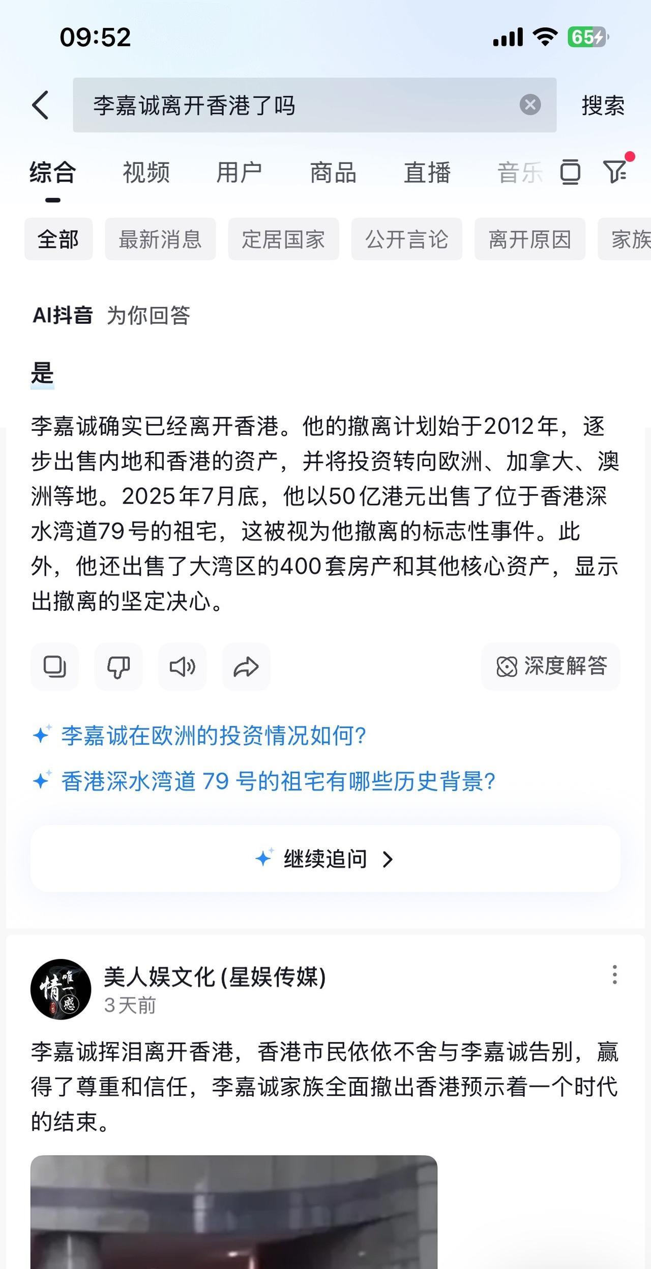 李嘉诚离开了生活了大几十年的香港,面对媒体与人们,简单且有礼貌地给:“多谢多谢,放我走吧!” 李嘉诚这一次真的离港了,短短一句话,道尽了他的心酸与无奈。这一次肯定不是谣传,因为抖音的Al也是这么回答的。 李嘉诚这一次不只抛售了惠州泷珀花园,就连中山的泷珀花园,以及广州逸翠庄园,还有东莞海逸豪庭多个项目在内的400套大湾区房子,连香港本土的楼盘都被李嘉诚抛售。甚至就连自己的婚房,位于香港深水香港深水湾道79号超级大别墅,也以50亿港元抛售。 值得一提的是,李嘉诚自从买了79号该栋别墅当婚房,事业也越做越大,越干越强,风生水起,屡屡创造奇迹,最终拥有自己的商业帝国。