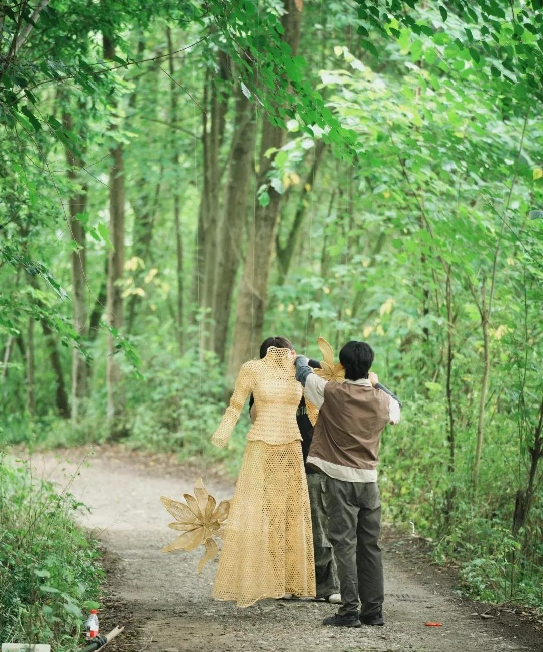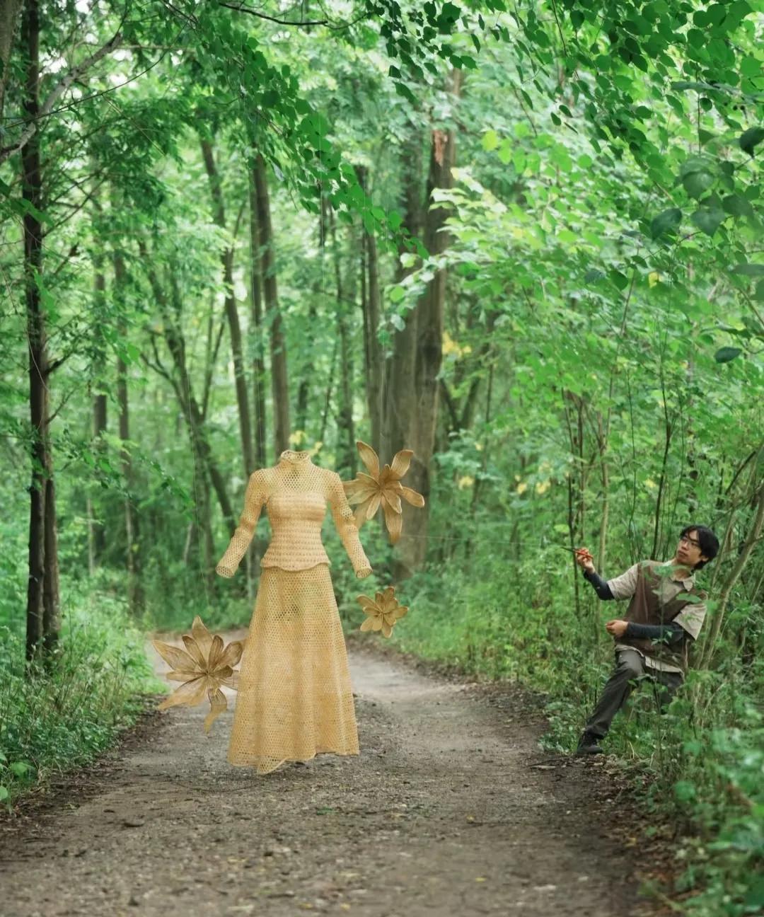 有创意,传统工艺与现代服饰设计的结合。可惜不能穿,只能当摆件。比编竹篮,竹席的产值高。上衣做成护甲应该可以穿,下身像西式礼服那样做半截可以当裙托。