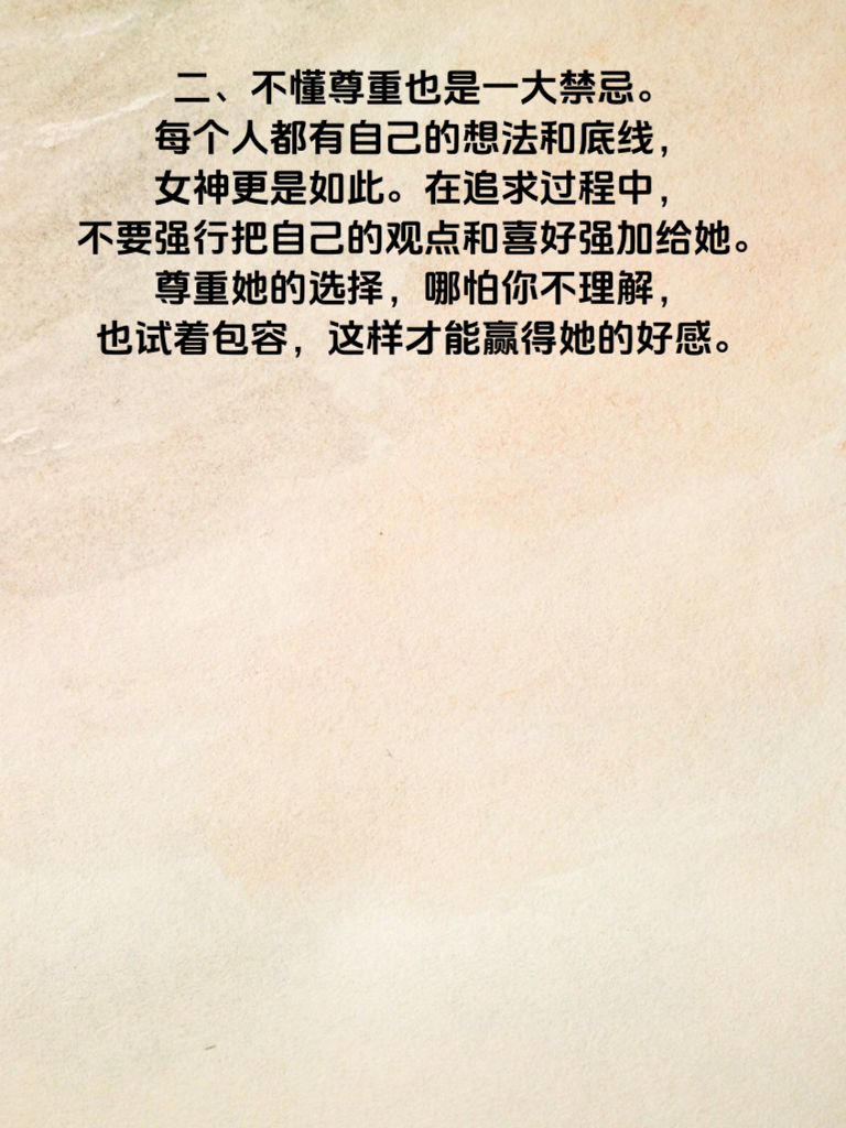 一、追求女神时,首先要避开过度纠缠的雷区。有些男生一旦喜欢上女神,就像失去理智般,不停地发消息、打电话,甚至频繁出现在女神面前。这不仅会让女神感到压力巨大,还可能让她对你产生反感。要明白,给彼此适当的空间,才能让感情更好地发展。 二、不懂尊重也是一大禁忌。每个人都有自己的想法和底线,女神更是如此。在追求过程中,不要强行把自己的观点和喜好强加给她。尊重她的选择,哪怕你不理解,也试着包容,这样才能赢得她的好感。 三、千万不要急于求成。感情的培养需要时间,妄图短期内就让女神爱上你是不现实的。真诚地对待每一次相处,用心去了解她,用行动慢慢打动她,而不是一味地催促她确定关系。 四、还有,不要在女神面前过度炫耀。财富、地位等外在的东西或许能吸引一时,但真正能走进她心里的,是你的内在品质。靠炫耀得来的关注,不会长久,展现真实的自己,才能收获真挚的感情。