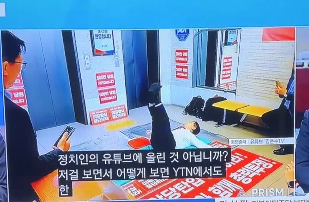 金文洙为了抗议李在明,弄了个静坐抗议,可能他觉得静静坐着太无聊了,就起身做了一套