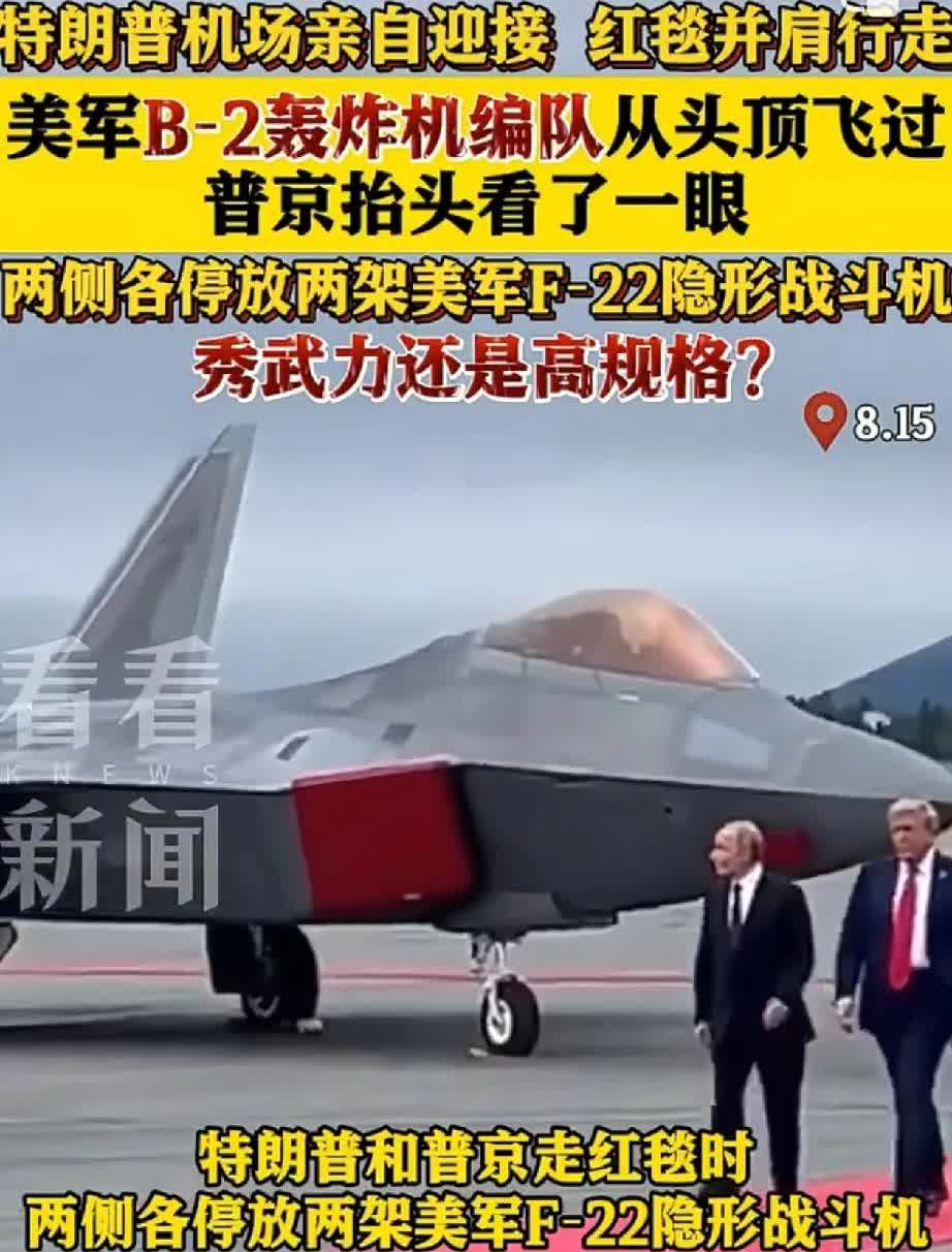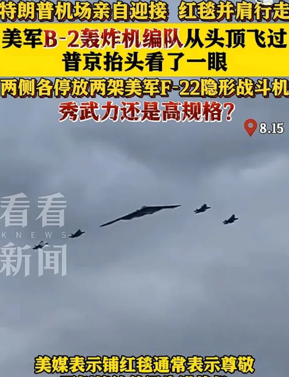 普京到访美国,特朗普亲自接待,两人行走时美国B-2轰炸机编队突然从他们头上飞过,