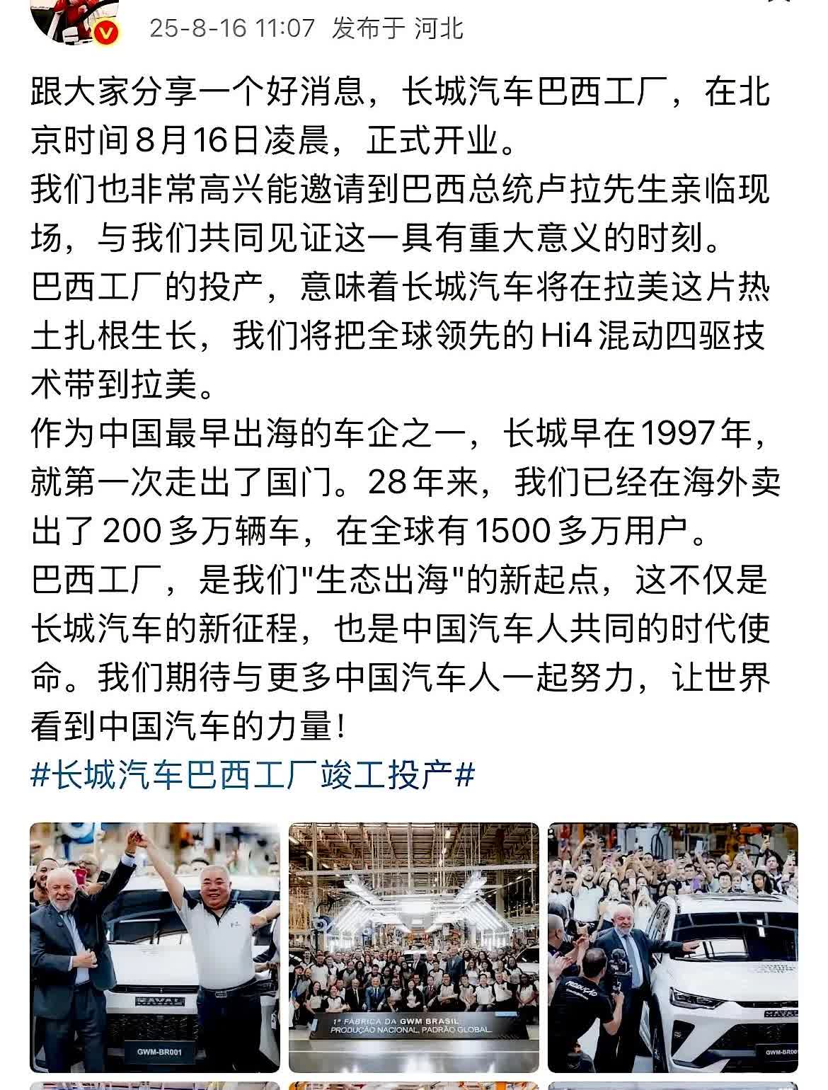 是我格局小了,得好好查查魏建军的长城汽车到底什么来头?收购奔驰在巴西唯一的乘用车工厂我没有惊讶,但在当地时间8月15日,长城汽车巴西工厂正式竣工投产时,巴西总统卢拉竟然亲临现场,没看错……巴西……总统,这应该就是巴西致以长城汽车的最高礼仪了吧! 中国汽车已经走向世界,长城将带动巴西当地的就业,促进了零部件本地化供应链建设,为中巴汽车产业合作注入新的活力,助力着拉美新能源产业发展,太厉害了! 长城汽车的巴西工厂初期产能为每年3万辆,预计到2028年将达到每年5万辆的产能。 这个工厂首批投产车型包括了哈弗H6系列(含汽油版、混动版)、哈弗H9以及2.4T长城炮皮卡。据说乙醇混合动力车型计划在一年后开始投产。