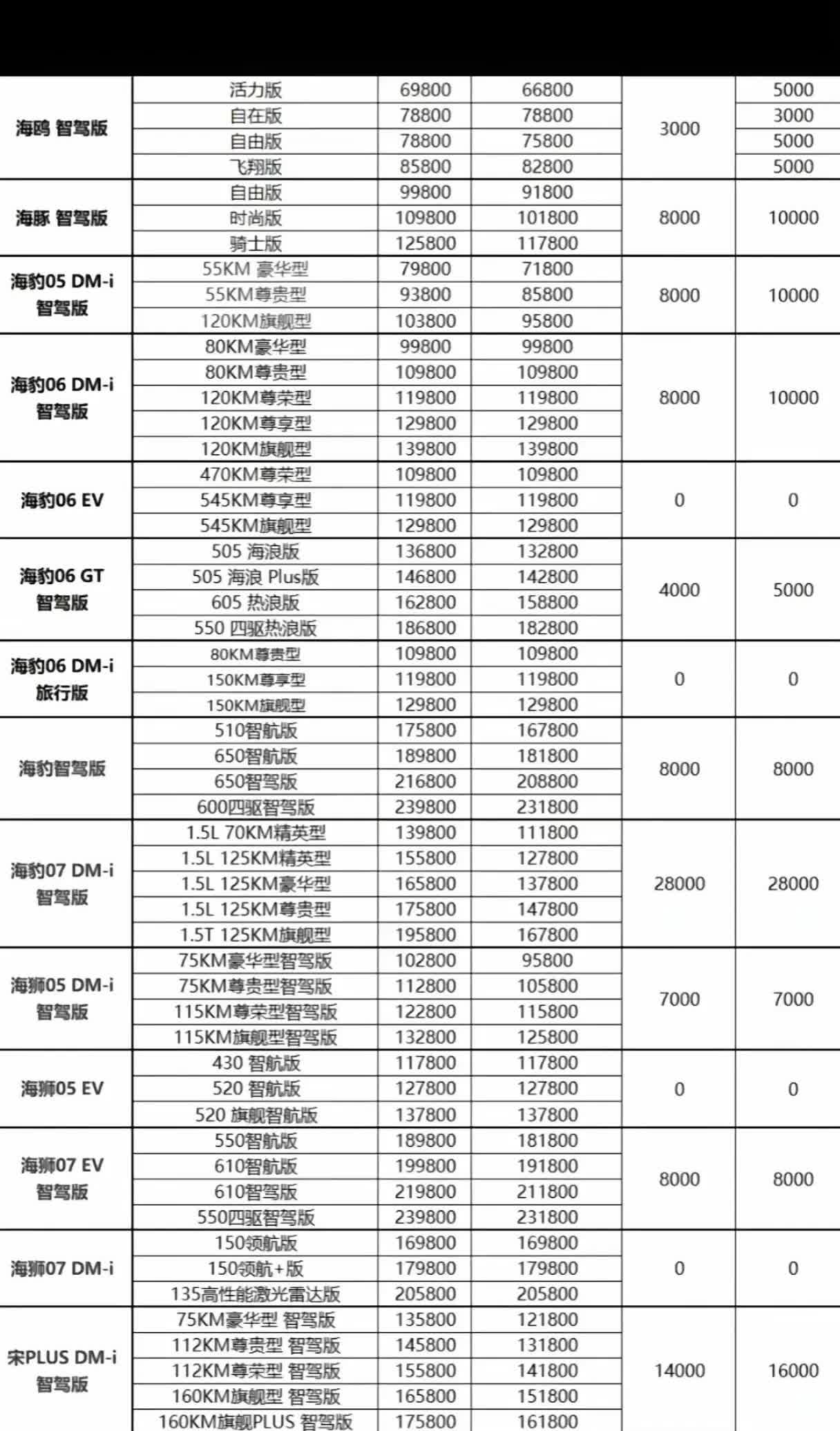 谁还记得比亚迪原来的优惠价?请见下图一,这是曾经优惠的价格,18.98万海狮07ev降3万14.98万,现在补贴很多地区要取消补贴了,目前这款18.98万的仅优惠8000元你会原指导价买吗? 一直观察发现迪子的ev车型(10万以上的)同续航的情况下会比其它的贵2万,例如东风的某款500续航10.58万指导价,而海狮05ev 500续航的要12.78。 准备买ev车型长续航的还是再观望下 目前最合理的价格是 400续航8万,500续航10万左右,600续航的12万左右,因电池成本降低100度容量的三元锂电池成本30000元,铁锂电池成本更低,所以不急用车的等等,如果一年用车不超过2万公里更没必要买phev或dmi 用电跑时天天拖着发动机和一箱油,而且保养还复杂更贵非常浪费。EVEV