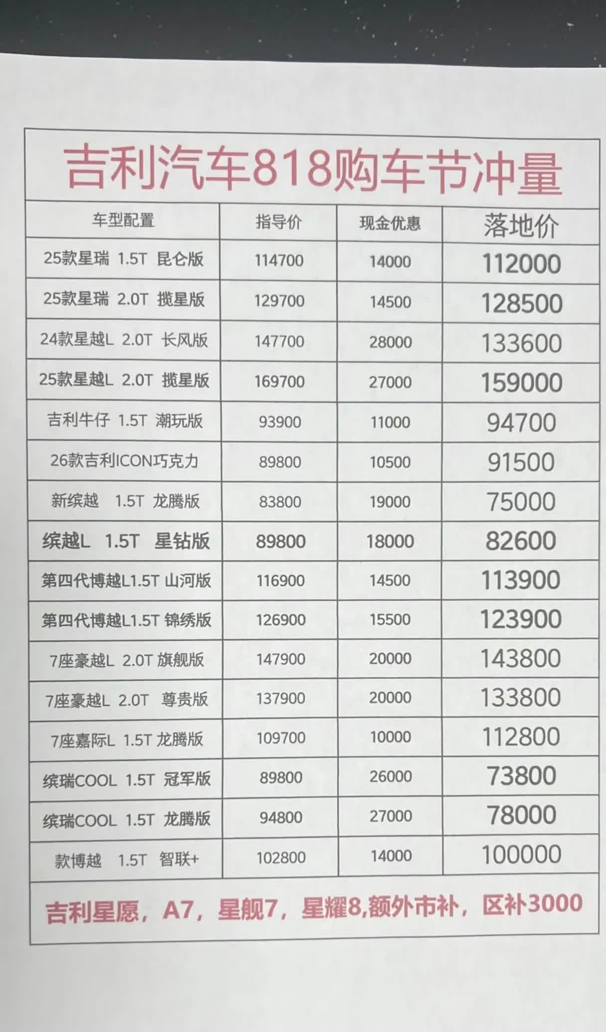 吉利汽车8月818政策出来了? 南方某市的价格政策. 优惠金额是没什