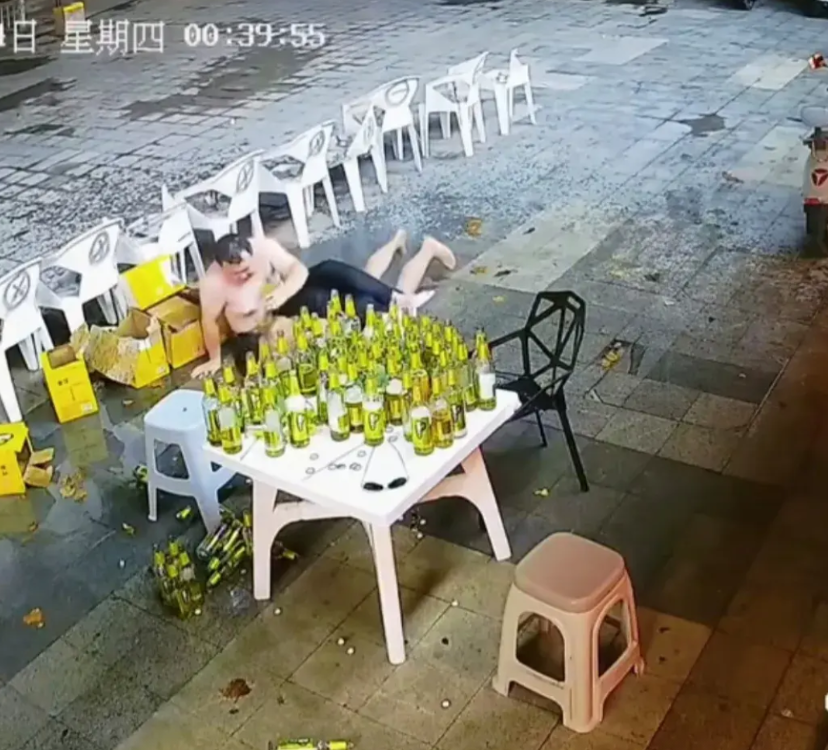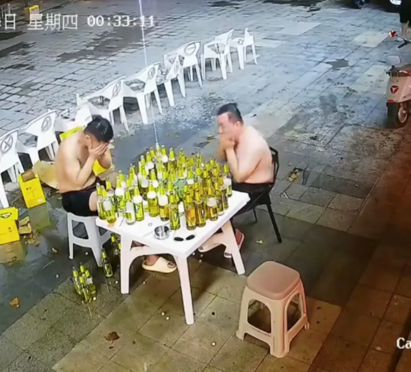 三人喝到兴奋时把桌上的啤酒挨个的都打开了,瓶里的啤酒由于压力就像喷泉一样,往天上冲,落到三人身上到处都是,后来女子可能是喝多了,退出了,蹲在路边看着两个男子继续拼酒。