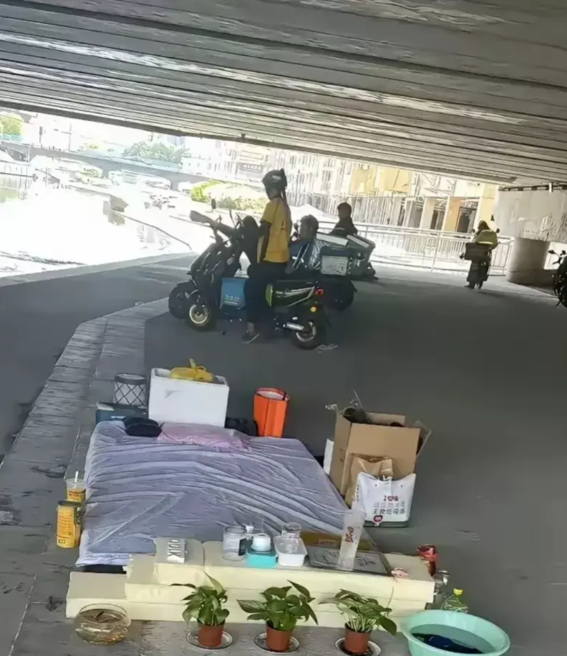 “彻底解释不清了”有一名外卖小哥中午在立交桥底下午休的时候,看到桥底下放着一张床跟一些生活用品,但却没有人在这里休息睡觉,旁边散落着一些喝过的饮料跟奶茶瓶子,这意味着,来这里睡觉休息的是有一定经济能力的。