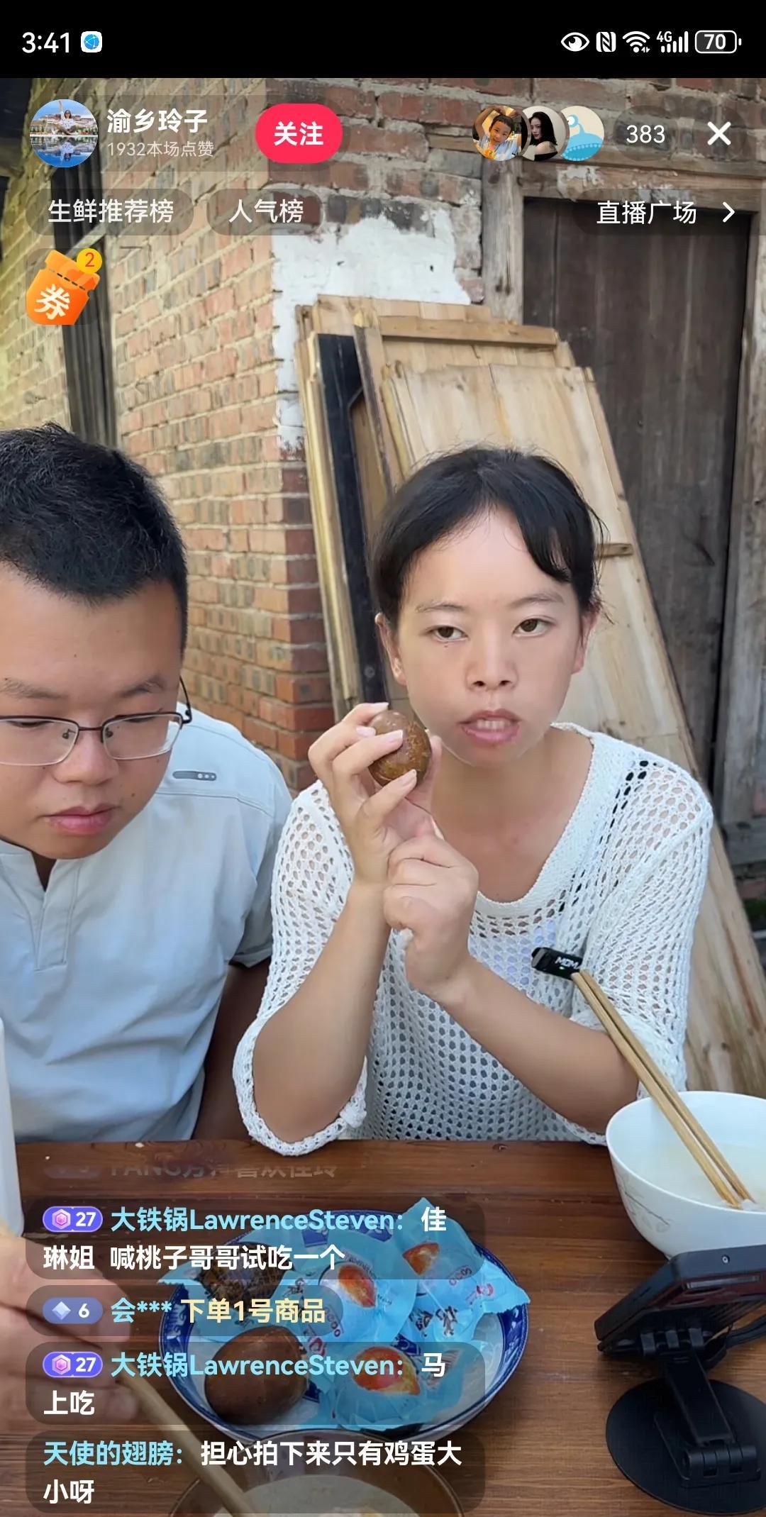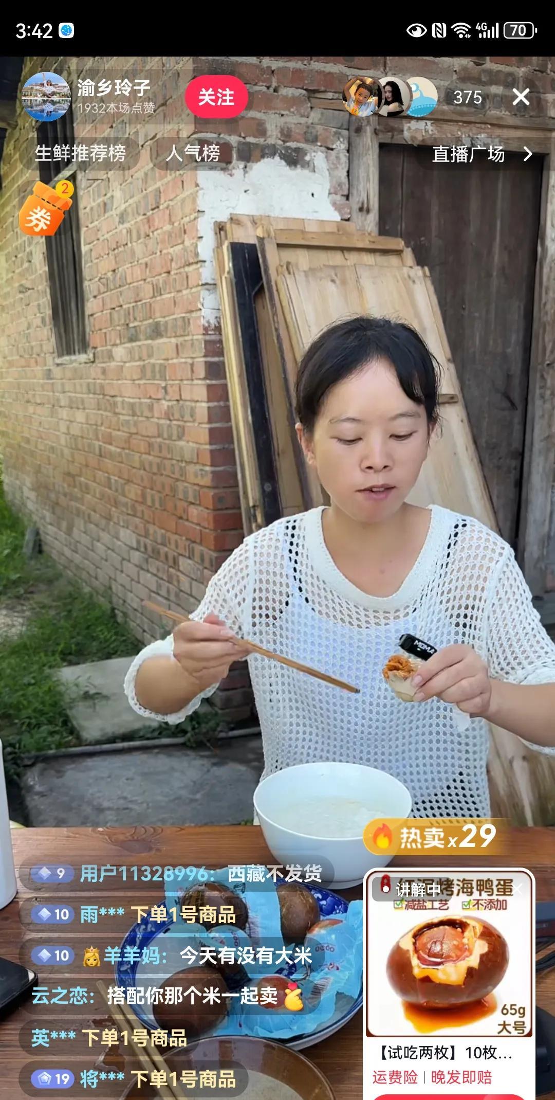 桃子一家人很勤劳,眼一睁就在搞钱。 上午,桃子妈妈开直播卖米,别人卖米是干巴巴的在那里讲品。她们家不一样,摄像头对着锅里,他妈妈边做饭边讲品。现在佳玲和桃子两口子卖咸鸭蛋,依然是那样,一碗咸鸭蛋配一碗白粥,边吃边讲。 主讲是佳玲,桃子坐旁边助讲。最近佳玲总用自己的号在播,几乎天天都有开播,估计他们又准备开辟新的赛道。桃子的大号卖农副产品,佳玲的号涨粉卖些别的东西,加上他们父母的号,一家人三个账号齐头并进,赚米那是哗哗的进账。