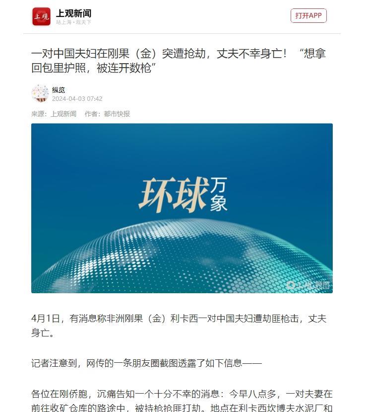 4月1日,一对中国夫妻在刚果金被人抢劫,夫妻把身上的财物乖乖拿给劫匪,但是,因为护照等证等还在包里,丈夫下车想叫劫匪拿回证件,造成劫匪不满,情绪激动朝男子连开数枪,丈夫倒地身亡。 在非洲的矿区公路上,一对中国夫妇本以为交出钱财就能保命,谁知丈夫一个举动引发惨剧。这起事件暴露了刚果金治安的乱象,让人不由得想:出门在外,遇到抢劫到底该怎么应对?安全提醒一再发出,却还是有人遇难。 这对夫妇是典型的在刚果金打拼的中国华侨,丈夫来自四川,早年就跑到非洲淘金,主要做矿产生意。刚果金矿产资源多,尤其是钴和铜,那地方吸引了不少中国人过去投资贸易。丈夫定居在上加丹加省的利卡西市,那是个矿业小镇,他每天得从市区开车去坎博韦地区的仓库,负责收矿石、检查质量、安排运输啥的。工作挺辛苦的,路不好走,尘土大,热带气候还容易生病。 他老婆也跟着一起生活,帮忙管账目、整理文件,两人租了当地房子,雇了个黑人司机开车,还找了个女保姆帮着打理家务。生活上他们适应得还行,融入华人圈子,加入卢阿拉巴华商会,商会里大家互相分享信息,讨论怎么避开风险。丈夫经验老道,扩展到小型冶炼合作,供应商网络建得不错。老婆支持后勤,两人一起面对矿区那些乱七八糟的事。 刚果金安全问题多,武装势力到处是,抢劫绑架常见,他们也知道这点,平时低调点,避开夜间出门,但矿业这行离不开现场,得硬着头皮去。商会提醒大家雇保镖啥的,他们雇了司机和保姆,算是一种防范。丈夫专注业务增长,老婆协调本地人手,日子过得有条理,但环境不确定性大。类似的中国商人不少,都在矿业链条上挣钱,夫妇俩算中规中矩的。 丈夫积累几年,业务稳了点,但风险始终在那。老婆偶尔去仓库帮忙,两人共同处理从采矿到出口的事。利卡西作为枢纽,华人多,夫妇建立联系,交换资源。工作周期固定,早出晚归,避免麻烦,但武装干扰时有发生。他们保持和本地警方沟通,报告潜在威胁,可矿区复杂,防不胜防。丈夫推业务,老婆管后勤,两人合力应对高温尘埃下的劳作。商会组织会议,夫妇参与,学安全知识,但现实中还是得靠自己。 事件发生在当地时间早上八点左右,夫妇坐在车后座,女保姆陪同,黑人司机开车往矿产仓库去。路上突然有武装人员开车逼近,投石块砸挡风玻璃,司机刹车停下后逃跑,车门没锁。武装人员拉开门,持枪要求交物品。夫妇顺从递出现金和包,保姆不动。武装人员抢走包后撤退,丈夫见护照文件还在里面,下车走几步要求归还。武装人员转身后开枪,击中丈夫头部和腹部,他倒地。 武装人员开车走人。地点在上加丹加省利卡西到坎博韦公路,靠近水泥厂路障。那天是4月1日,夫妇本是去收矿仓库。司机逃离后,武装人员直接针对车内。夫妇交出财物,本以为没事,丈夫举动引发枪击。武装人员情绪激动,连开数枪。丈夫中弹身亡,妻子和保姆幸免。事件细节经当地市长确认,抢走钱额未知。警方记录为持枪抢劫致死。夫妇携带现金和文件,常见于矿业贸易。武装人员拦车常见,该地区治安差。丈夫要回护照合理,但激怒对方。 枪击近距离,头部腹部致命。事件后现场混乱,鲜血染地。武装人员得手逃离,车辆消失。市长称武装人员不文明,调查启动。夫妇日常出行就这样出事。矿区公路风险高,类似袭击多。丈夫举动虽小,却酿惨剧。妻子目睹一切,无伤。保姆协助,但无力改变。事件暴露防范不足。武装人员持枪优势大,夫妇无反抗。抢劫过程快速,几分钟结束。丈夫下车瞬间决定命运。 警方收集弹壳,追查轨迹。事件提醒华人警惕。矿业工作者常遇此险。夫妇本是普通贸易者,却遇不幸。武装人员抢钱为主,枪击因不满。调查显示无预谋,随机拦车。夫妇交财保命策略常见,但文件重要性大。丈夫四川籍,身份确认快。事件在华人圈传开,商会通报。安全问题再被强调。抢劫金额不明,焦点在枪杀。武装人员身份未知,逃逸成功。夫妇生活中断,惨案发生。 事发后,当地市长亨利-蒙贡巴到现场,指挥警方封锁路段,捡弹壳问目击者,查车辆轨迹和钱数。中国大使馆马上联系内政部,要快破案抓人,提供案情。使馆找家属确认,帮办遗体运送,从利卡西殡仪馆转移。卢阿拉巴华商会发公告,叫华人注意安全,别直接对持枪的。警方走访居民,找线索,但武装区难进展。使馆跟执法,帮家属办保险财产。 省里延长宵禁,加巡逻。妻子医院检查没事,回住所,保姆帮收拾。调查几个月,没报道抓到人,武装身份不明。使馆更新提醒,东部冲突多,少出门,雇安保。家属通过使馆办后事,丈夫遗体回国葬,妻子离开刚果金,回国内住。商会办悼念,华人加强互助。警方档记录抢劫致死,案子开着。类似案子多,两年前另一夫妇仓库中枪死,商会悬赏1万美元线索。 打拼安全咋办?商会说别反抗,有人觉得该硬气点。你怎么看?欢迎留言分享看法,一起讨论怎么更好地保护自己。
