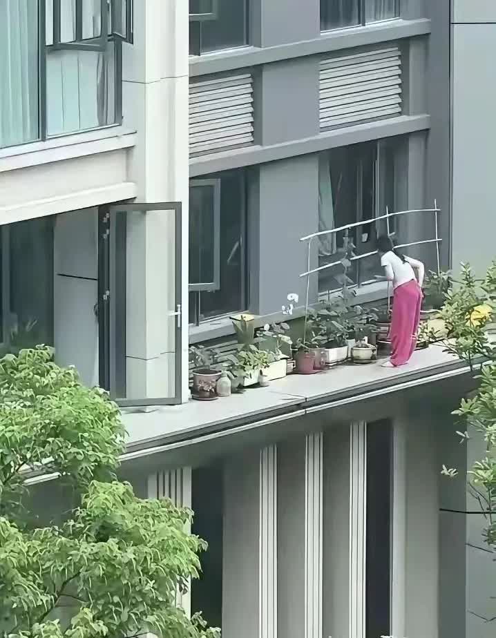 在网上看到两张照片,一个女子在自家阳台上种花,这个阳台居然没有护栏。 这种淡定自如的画面自配不如。 都说女子有恐高症,看到这个女子,虽然你没有恐高症,但是也要注意自身的安全呀。 作为一个大老爷们,看照片我的腿都哆嗦。